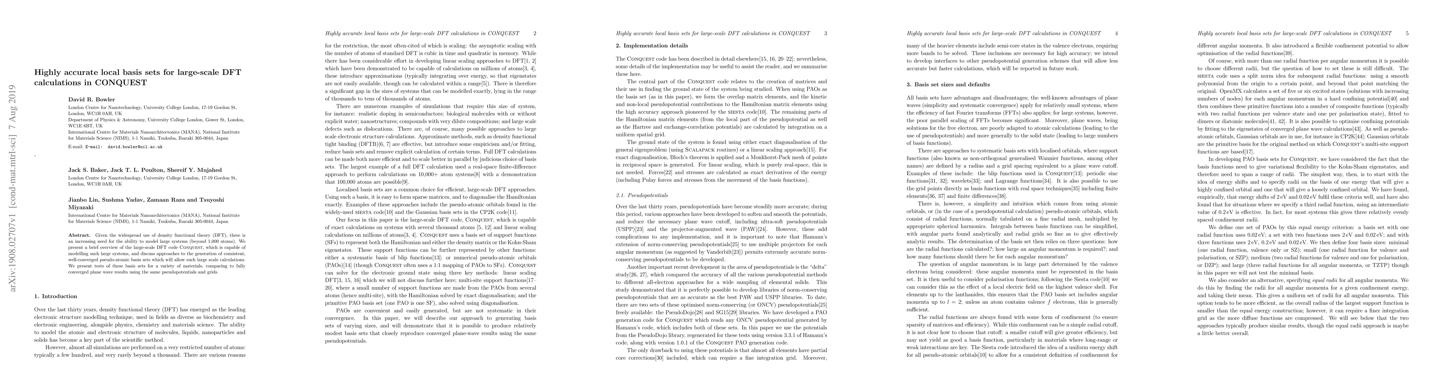 This paper introduces highly accurate local basis sets for large-scale DFT calculations in the CONQUEST code, designed to model systems with over 1,000 atoms, and evaluates their performance against fully converged plane wave results.