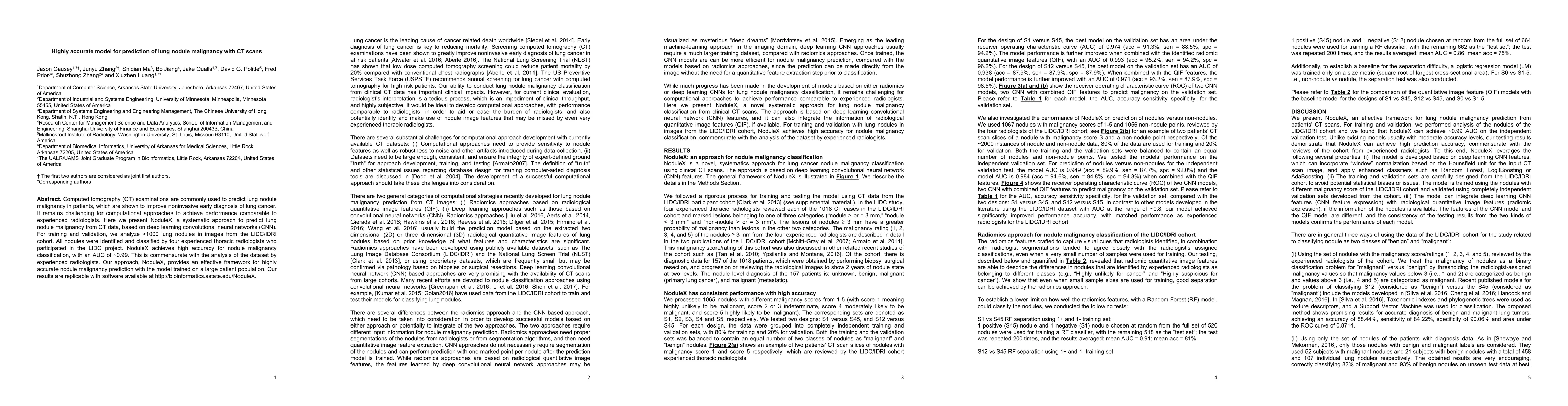 Computed tomography (CT) examinations are commonly used to predict lung nodule malignancy in patients, which are shown to improve noninvasive early diagnosis of lung cancer. It remains challenging for computational approaches to achieve performance comparable to experienced radiologists. Here we present NoduleX, a systematic approach to predict lung nodule malignancy from CT data, based on deep learning convolutional neural networks (CNN). For training and validation, we analyze >1000 lung nodules in images from the LIDC/IDRI cohort. All nodules were identified and classified by four experienced thoracic radiologists who participated in the LIDC project. NoduleX achieves high accuracy for nodule malignancy classification, with an AUC of ~0.99. This is commensurate with the analysis of the dataset by experienced radiologists. Our approach, NoduleX, provides an effective framework for highly accurate nodule malignancy prediction with the model trained on a large patient population. Our results are replicable with software available at http://bioinformatics.astate.edu/NoduleX.
