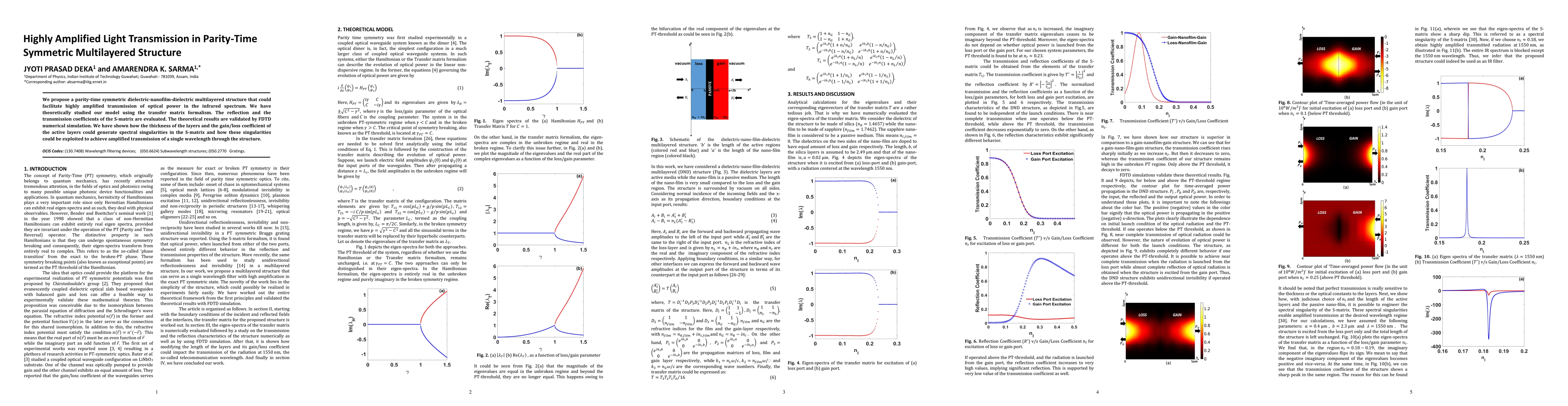 We propose a parity-time symmetric dielectric-nanofilm-dielectric multilayered structure that could facilitate highly amplified transmission of optical power in the infrared spectrum. We have theoretically studied our model using the transfer matrix formalism. The reflection and the transmission coefficients of the S-matrix are evaluated. The theoretical results are validated by FDTD numerical simulation. We have shown how the thickness of the layers and the gain/loss coefficient of the active layers could generate spectral singularities in the S-matrix and how these singularities could be exploited to achieve amplified transmission of a single wavelength through the structure.