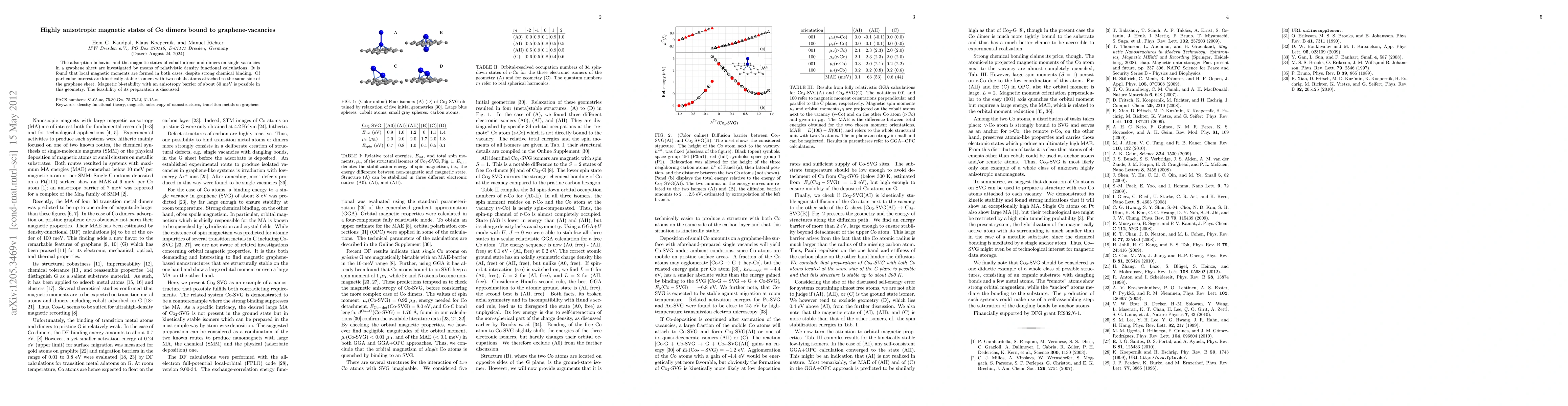 The adsorption behavior and the magnetic states of cobalt atoms and dimers on single vacancies in a graphene sheet are investigated by means of relativistic density functional calculations. It is found that local magnetic moments are formed in both cases, despite strong chemical binding. Of particular interest are kinetically stable isomers with two cobalt atoms attached to the same side of the graphene sheet. Magnetic bi-stability with an anisotropy barrier of about 50 meV is possible in this geometry. The feasibility of its preparation is discussed.