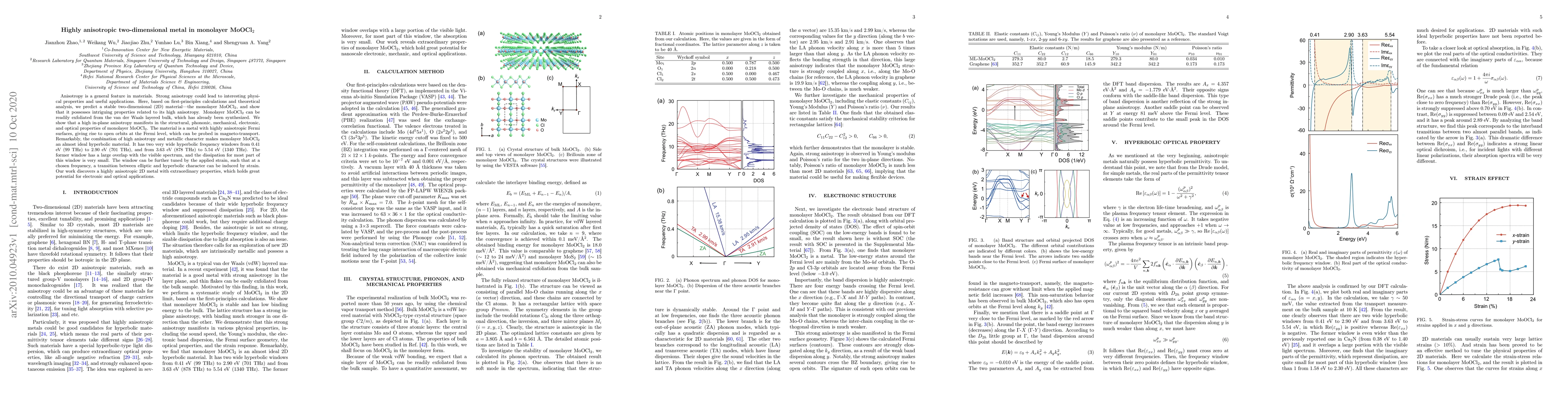 The research predicts the existence of a stable, highly anisotropic two-dimensional metal—monolayer MoOCl$_2$—with unique electronic and optical properties, including wide hyperbolic frequency windows and tunable characteristics via strain, suggesting promising applications in electronics and optics.