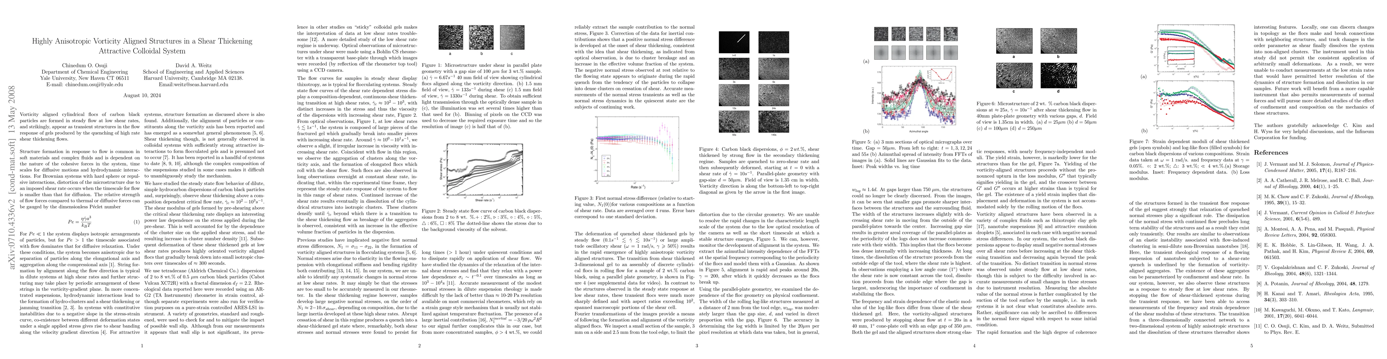 Vorticity aligned cylindrical flocs of carbon black particles are coincident with a primary shear thickening transition in steady flow and also appear as transient structures in the flow response of gels produced by a secondary shear thickening at high shear rates.