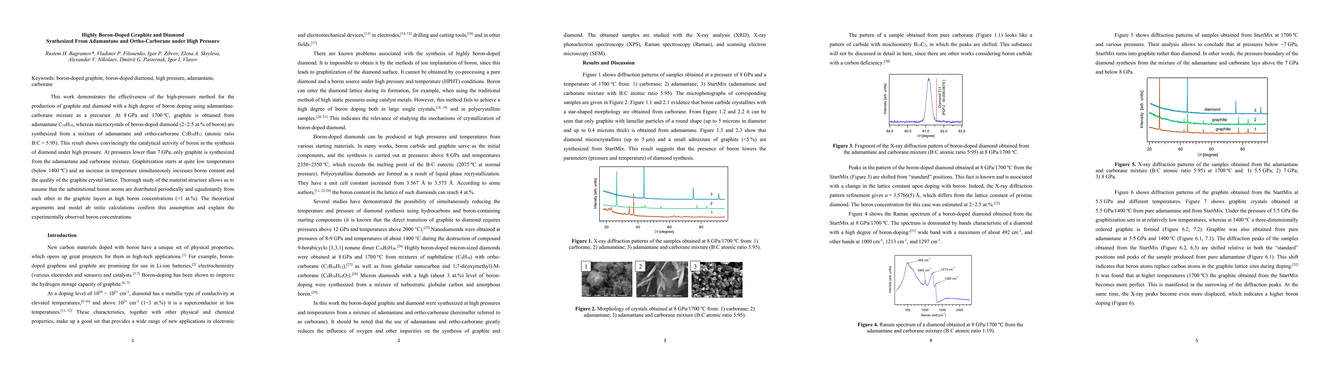 This study shows that high-pressure synthesis can produce highly boron-doped graphite and diamond using an adamantane-ortho-carborane mixture. At 8 GPa and $1700 ^{o}C$, boron-doped diamond with 2-2.5 at.% boron is synthesized, demonstrating boron's catalytic role in diamond formation under high pressure.