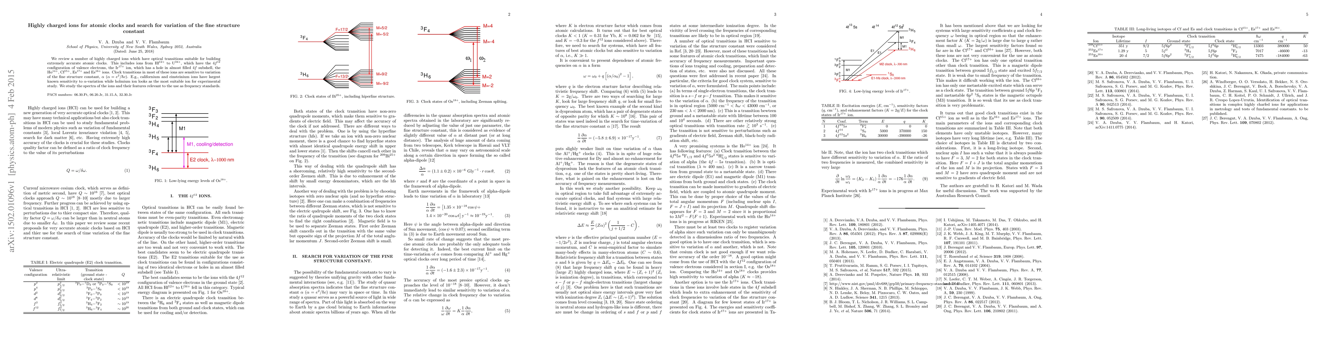 This paper reviews highly charged ions, including Hf$^{12+}$ to U$^{34+}$, Ir$^{17+}$, and several others, for their potential in building precise atomic clocks. These ions exhibit transitions sensitive to variations in the fine structure constant, with californium and einsteinium ions showing the highest sensitivity, while holmium appears most suitable for experimental studies.