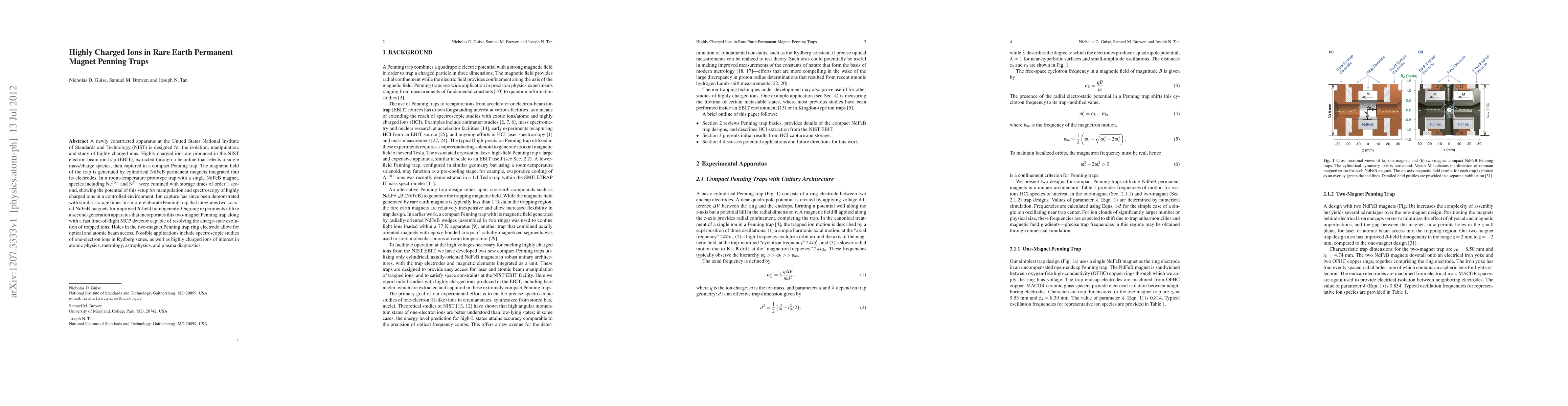 This paper details the construction and initial results of a new Penning trap system at NIST, utilizing rare earth permanent magnets to confine highly charged ions for spectroscopic studies. The apparatus successfully captures ions like Ne10+ and N7+ for storage times of around 1 second, paving the way for advanced research in atomic physics, metrology, astrophysics, and plasma diagnostics.