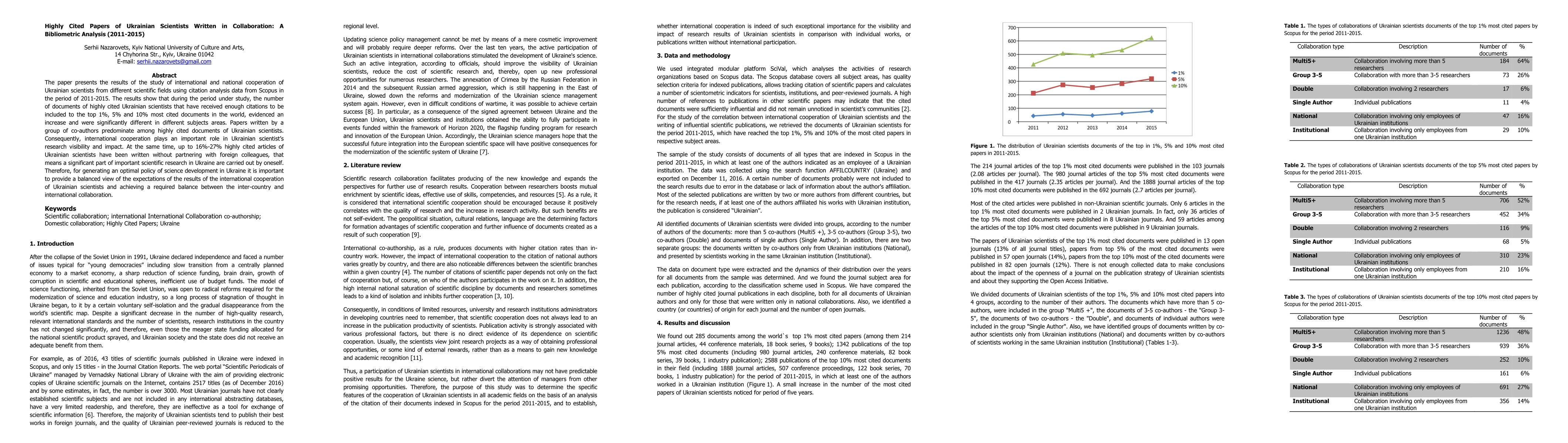 This bibliometric analysis examines the international and national collaboration of Ukrainian scientists from 2011-2015, revealing that highly cited papers predominantly involve co-authorship, with international partnerships significantly boosting visibility and impact. Despite this, a notable portion of highly cited works is produced independently, underscoring the importance of balancing international collaboration with domestic efforts in Ukraine's scientific development.
