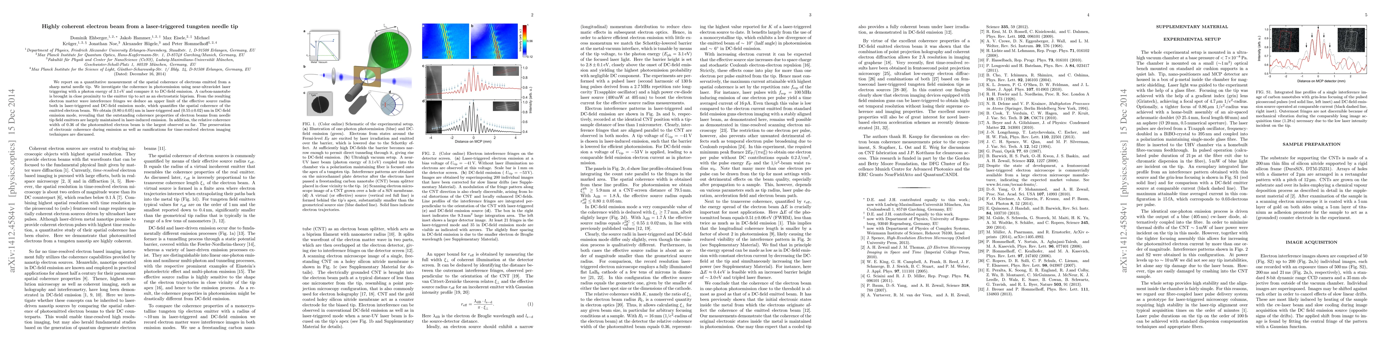 This paper measures the spatial coherence of electrons emitted from a tungsten needle tip using laser and DC-field triggering, finding an effective source radius of $(0.80\pm 0.05)\,$nm for laser-triggered emission and $(0.55\pm 0.02)\,$nm for DC-field emission, indicating high coherence in both modes.