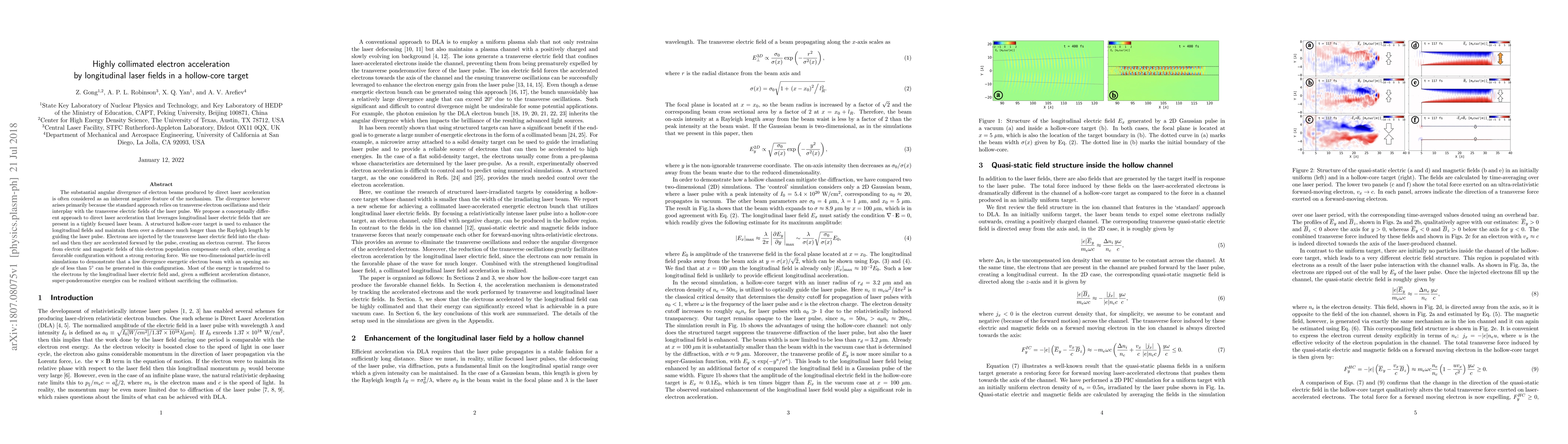 This paper proposes a novel method for highly collimated electron acceleration using longitudinal laser fields within a hollow-core target, demonstrating through simulations that it can generate an energetic electron beam with an opening angle of less than 5°, significantly reducing the usual angular divergence.