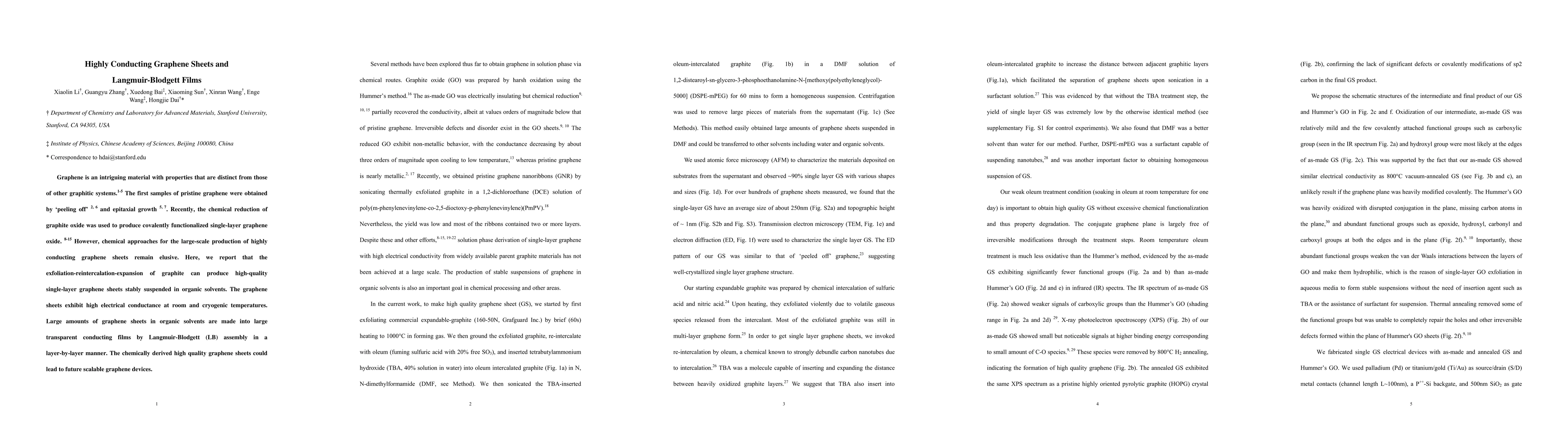 This study reports a method for producing high-quality, highly conducting single-layer graphene sheets via exfoliation-reintercalation-expansion of graphite, which are then assembled into transparent conducting films using Langmuir-Blodgett techniques. These graphene sheets exhibit excellent electrical conductivity at various temperatures and hold promise for scalable graphene-based devices.