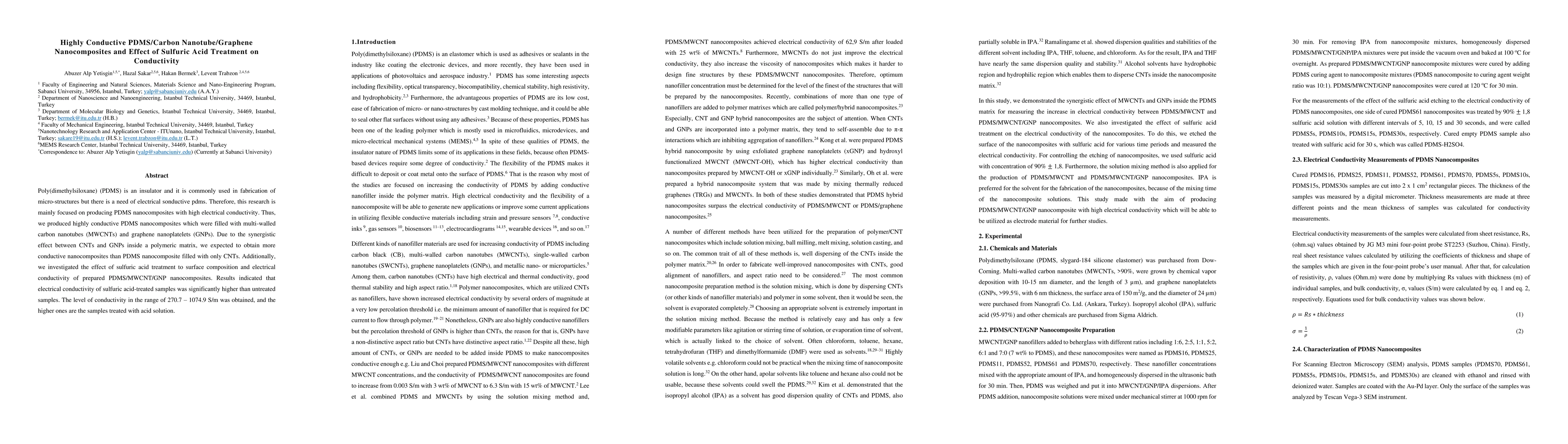 This study synthesizes highly conductive PDMS nanocomposites incorporating multiwalled carbon nanotubes and graphene nanoplatelets, achieving significant electrical conductivity improvements due to their synergistic effect. Sulfuric acid treatment further enhances conductivity, resulting in values ranging from 270.7 to 1074.9 S/m, with treated samples showing markedly higher conductivity.