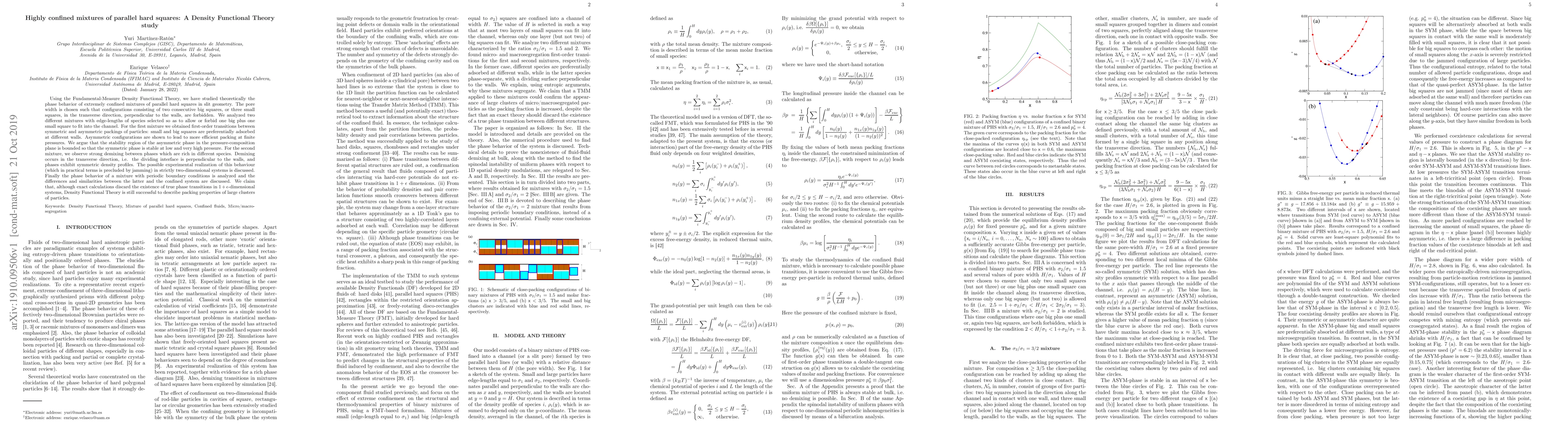 Using the Fundamental-Measure Density Functional Theory, we have studied theoretically the phase behavior of extremely confined mixtures of parallel hard squares in slit geometry. The pore width is chosen such that configurations consisting of two consecutive big squares, or three small squares, in the transverse direction, perpendicular to the walls, are forbidden. We analyzed two different mixtures with edge-lengths of species selected so as to allow or forbid one big plus one small square to fit into the channel. For the first mixture we obtained first-order transitions between symmetric and asymmetric packings of particles: small and big squares are preferentially adsorbed at different walls. Asymmetric configurations are shown to lead to more efficient packing at finite pressures. We argue that the stability region of the asymmetric phase in the pressure-composition plane is bounded so that the symmetric phase is stable at low and very high pressure. For the second mixture, we observe strong demixing between phases which are rich in different species. Demixing occurs in the transverse direction, i.e. the dividing interface is perpendicular to the walls, and phases exhibit symmetric density profiles. The possible experimental realization of this behaviour (which in practical terms is precluded by jamming) in strictly two-dimensional systems is discussed. Finally the phase behavior of a mixture with periodic boundary conditions is analyzed and the differences and similarities between the latter and the confined system are discussed. We claim that, although exact calculations discard the existence of true phase transitions in $1+\epsilon$-dimensional systems, Density Functional Theory is still successful to describe packing properties of large clusters of particles.