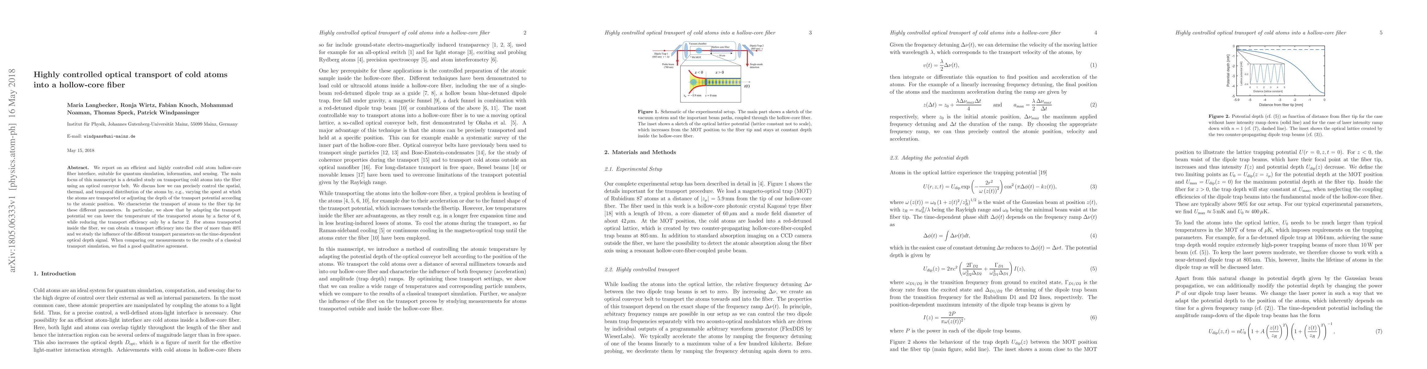 This paper details a highly controlled method for transporting cold atoms into a hollow-core fiber using an optical conveyor belt, achieving precise control over spatial, thermal, and temporal distributions. The study demonstrates a sixfold reduction in atom temperature with only a twofold reduction in transport efficiency, achieving over 40% transport efficiency into the fiber.