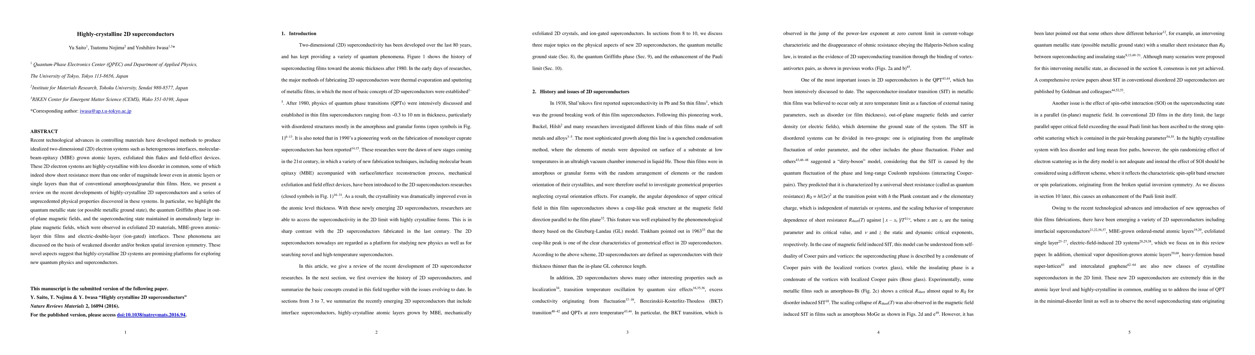 This paper reviews recent advancements in producing highly-crystalline 2D superconductors, highlighting unprecedented physical properties such as quantum metallic states and superconducting states in large magnetic fields, driven by reduced disorder and broken symmetry. These findings suggest potential for new quantum physics exploration.
