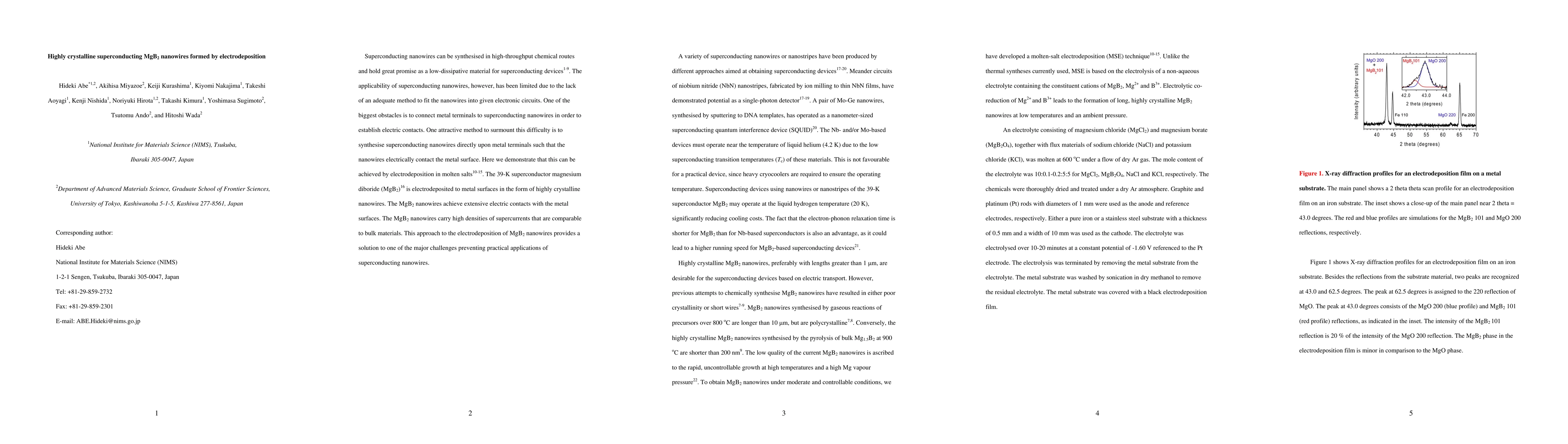 This paper demonstrates the successful electrodeposition of highly crystalline superconducting MgB2 nanowires directly onto metal terminals in molten salts, achieving extensive electrical contacts and high supercurrent densities comparable to bulk materials. This method addresses a key challenge in integrating superconducting nanowires into electronic circuits.