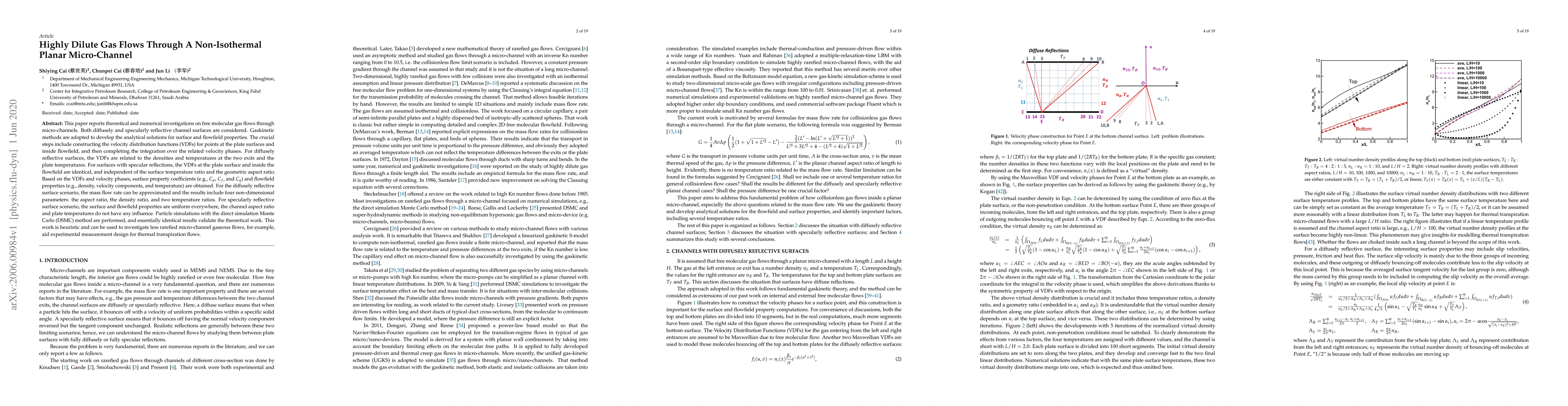 This paper reports theoretical and numerical investigations on free molecular gas flows through micro-channels. Both diffusely and specularly reflective channel surfaces are considered. Gaskinetic methods are adopted to develop the analytical solutions for surface and flowfield properties. The crucial steps include constructing the velocity distribution functions (VDFs) for points at the plate surfaces and inside flowfield, and then completing the integration over the related velocity phases. For diffusely reflective surfaces, the VDFs are related to the densities and temperatures at the two exits and the plate temperatures. For surfaces with specular reflections, the VDFs at the plate surface and inside the flowfield are identical, and independent of the surface temperature ratio and the geometric aspect ratio. Based on the VDFs and velocity phases, surface property coefficients (e.g., C_p, C_f, and C_q) and flowfield properties (e.g., density, velocity components, and temperature) are obtained. For the diffusely reflective surface scenario, the mass flow rate can be approximated and the results include four non-dimensional parameters: the aspect ratio, the density ratio, and two temperature ratios. For specularly reflective surface scenario, the surface and flowfield properties are uniform everywhere, the channel aspect ratio and plate temperatures do not have any influence. Particle simulations with the direct simulation Monte Carlo (DSMC) method are performed, and essentially identical results validate the theoretical work. This work is heuristic and can be used to investigate less rarefied micro-channel gaseous flows, for example, aid experimental measurement design for thermal transpiration flows.