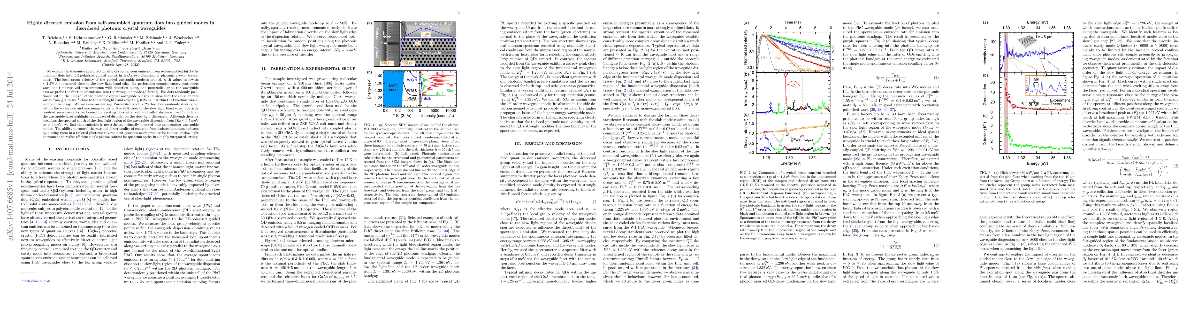 This paper investigates the directionality and dynamics of spontaneous emission from self-assembled quantum dots into guided modes in disordered photonic crystal waveguides, achieving highly directed emission with an average Purcell-factor of $\sim 2\times$ and a $\beta$-factor of $\sim 90\%$ near the slow-light band edge. The study highlights the potential for efficient single photon sources in quantum optics.