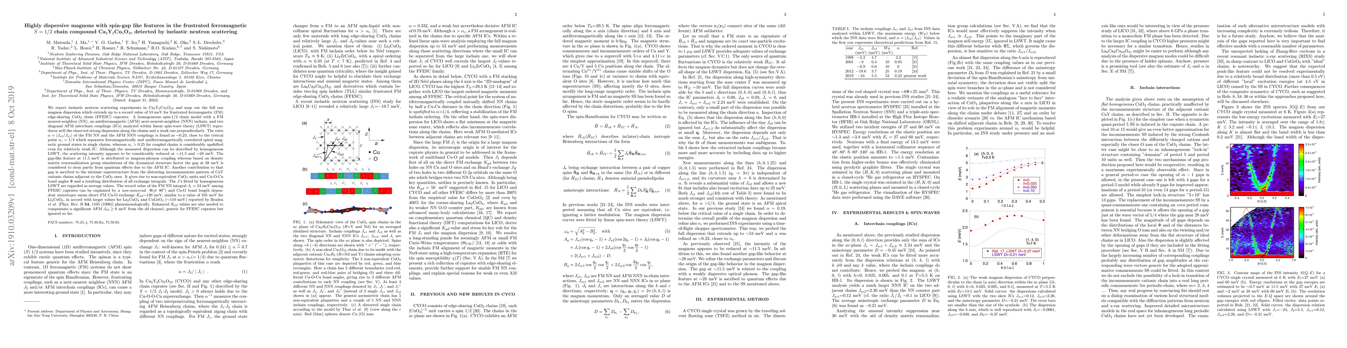 We report inelastic neutron scattering experiments in Ca2Y2Cu5O10 and map out the full one magnon dispersion which extends up to a record value of 53 meV for frustrated ferromagnetic (FM) edge-sharing CuO2 chain (FFESC) cuprates. A homogeneous spin-1/2 chain model with a FM nearest-neighbor (NN), an antiferromagnetic (AFM) next-nearest-neighbor (NNN) inchain, and two diagonal AFM interchain couplings (ICs) analyzed within linear spin-wave theory (LSWT) reproduces well the observed strong dispersion along the chains and a weak one perpendicularly. The ratio R=|J_{a2}/J_{a1}| of the FM NN and the AFM NNN couplings is found as ~0.23, close to the critical point Rc=1/4 which separates ferromagnetically and antiferromagnetically correlated spiral magnetic ground states in single chains, whereas Rc>0.25 for coupled chains is considerably upshifted even for relatively weak IC. Although the measured dispersion can be described by homogeneous LSWT, the scattering intensity appears to be considerably reduced at ~11.5 and ~28 meV. The gap-like feature at 11.5 meV is attributed to magnon-phonon coupling whereas based on DMRG simulations of the dynamical structure factor the gap at 28 meV is considered to stem partly from quantum effects due to the AFM IC. Another contribution is ascribed to the intrinsic superstructure from the distorting incommensurate pattern of CaY cationic chains adjacent to the CuO2 ones. It gives rise to non-equivalent CuO4 units and Cu-O-Cu bond angles Phi and a resulting distribution of all exchange integrals. The J's fitted by homogeneous LSWT are regarded as average values. The record value of the FM NN integral J1=24 meV among FFESC cuprates can be explained by a non-universal Phi (not 90 deg.) and Cu-O bond length dependent anisotropic mean direct FM Cu-O exchange K_{pd}~120 meV. Enhanced K_{pd} values are also needed to compensate a significant AFM J_{dd} > ~6 meV.