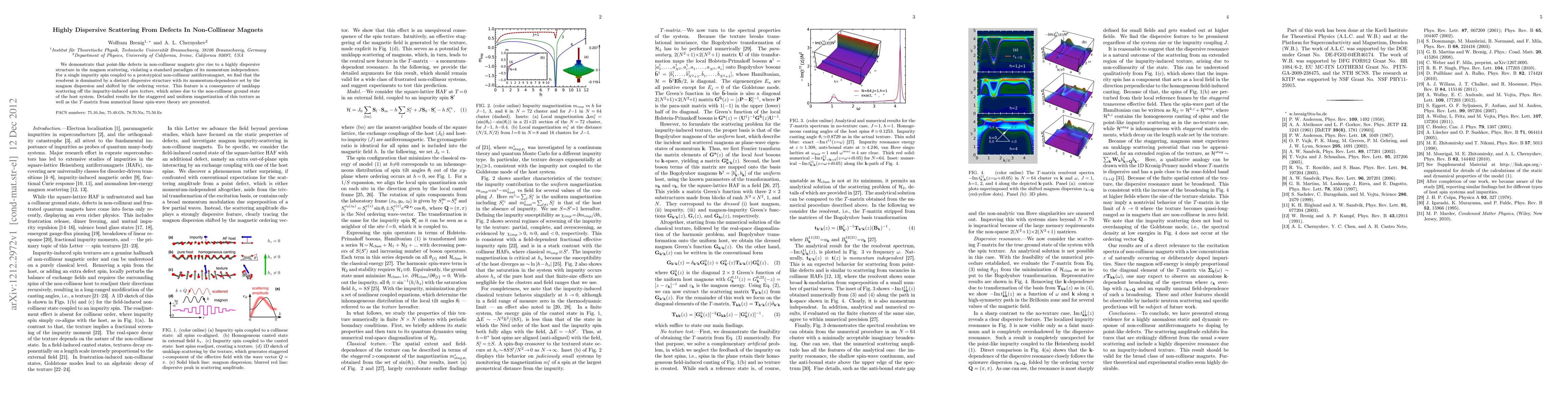 This paper reveals that point-like defects in non-collinear magnets lead to highly dispersive scattering in magnon interactions, breaking the conventional assumption of momentum independence. The study finds a distinct momentum-dependent structure in the resolvent, driven by umklapp scattering and the non-collinear spin texture of the host system.