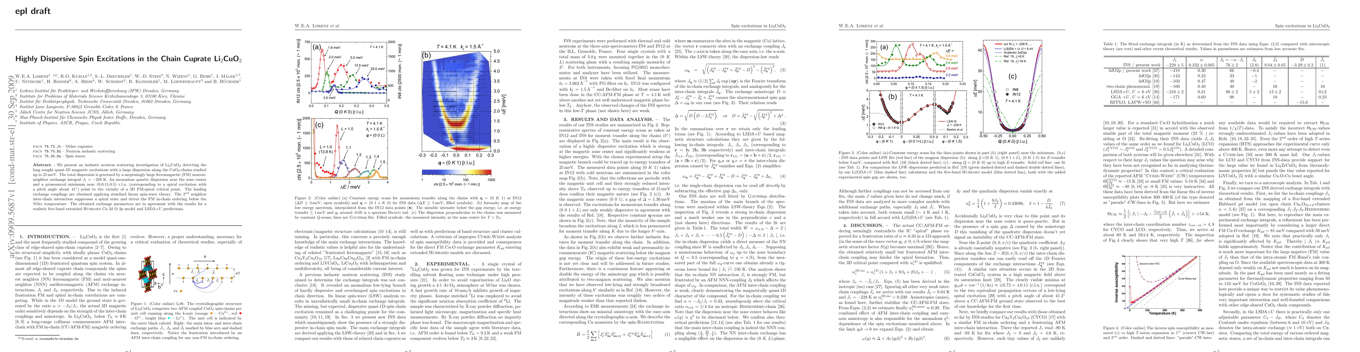 Researchers discovered quasi-1D magnetic excitations in Li2CuO2 with a large dispersion along CuO2 chains, governed by a strong ferromagnetic exchange integral. The findings support predictions for a realistic five-band model and suggest that inter-chain interactions suppress spiral states.