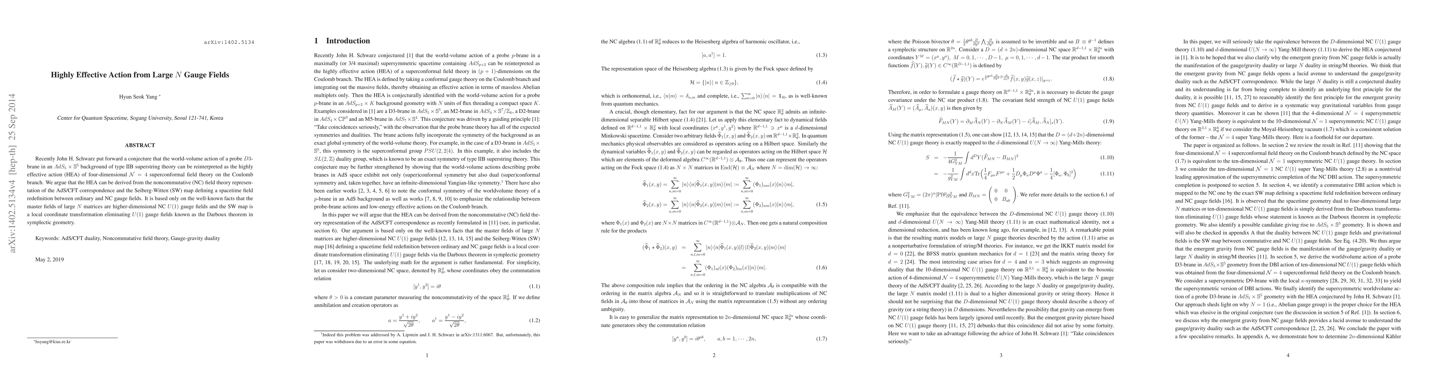 Recently John H. Schwarz put forward a conjecture that the world-volume action of a probe D3-brane in an AdS5 x S5 background of type IIB superstring theory can be reinterpreted as the highly effective action (HEA) of four-dimensional N=4 superconformal field theory on the Coulomb branch. We argue that the HEA can be derived from the noncommutative (NC) field theory representation of the AdS/CFT correspondence and the Seiberg-Witten (SW) map defining a spacetime field redefinition between ordinary and NC gauge fields. It is based only on the well-known facts that the master fields of large N matrices are higher-dimensional NC U(1) gauge fields and the SW map is a local coordinate transformation eliminating U(1) gauge fields known as the Darboux theorem in symplectic geometry.