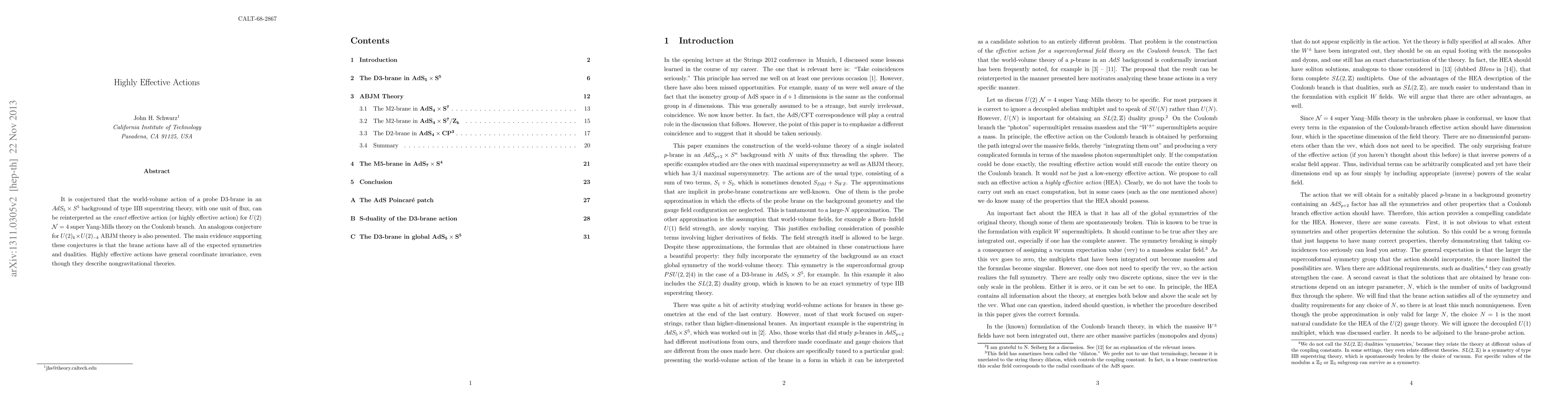 It is conjectured that the world-volume action of a probe D3-brane in an $AdS_5 \times S^5$ background of type IIB superstring theory, with one unit of flux, can be reinterpreted as the exact effective action (or highly effective action) for U(2), ${\cal N} = 4$ super Yang-Mills theory on the Coulomb branch. An analogous conjecture for $U(2)_k \times U(2)_{-k} $ ABJM theory is also presented. The main evidence supporting these conjectures is that the brane actions have all of the expected symmetries and dualities. Highly effective actions have general coordinate invariance, even though they describe nongravitational theories.