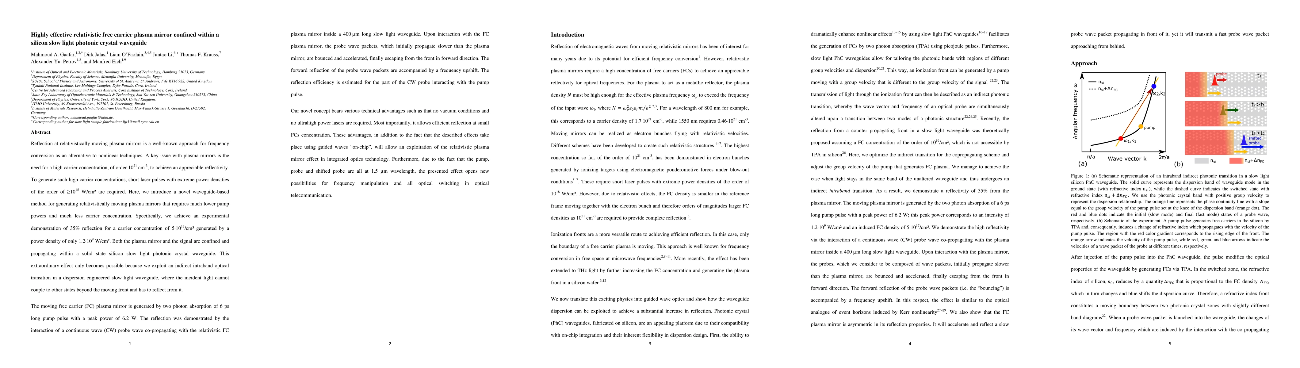 Reflection at relativistically moving plasma mirrors is a well-known approach for frequency conversion as an alternative to nonlinear techniques. A key issue with plasma mirrors is the need for a high carrier concentration, of order 10^21 cm^-3, to achieve an appreciable reflectivity. To generate such high carrier concentrations, short laser pulses with extreme power densities of the order >10^15 W/cm^2 are required. Here, we introduce a novel waveguide-based method for generating relativistically moving plasma mirrors that requires much lower pump powers and much less carrier concentration. Specifically, we achieve an experimental demonstration of 35% reflection for a carrier concentration of 5*10^17/cm^3 generated by a power density of only 1.2*10^9 W/cm^2. Both the plasma mirror and the signal are confined and propagating within a solid state silicon slow light photonic crystal waveguide. This extraordinary effect only becomes possible because we exploit an indirect intraband optical transition in a dispersion engineered slow light waveguide, where the incident light cannot couple to other states beyond the moving front and has to reflect from it. The moving free carrier (FC) plasma mirror is generated by two photon absorption of 6 ps long pump pulse with a peak power of 6.2 W. The reflection was demonstrated by the interaction of a continuous wave (CW) probe wave co-propagating with the relativistic FC plasma mirror inside a 400 micro-meter long slow light waveguide. Upon interaction with the FC plasma mirror, the probe wave packets, which initially propagate slower than the plasma mirror, are bounced and accelerated, finally escaping from the front in forward direction. The forward reflection of the probe wave packets are accompanied by a frequency upshift. The reflection efficiency is estimated for the part of the CW probe interacting with the pump pulse.
