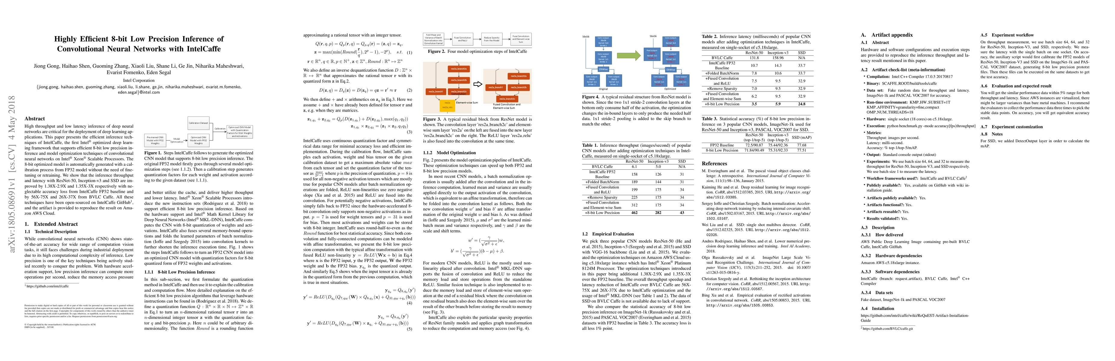 This paper presents IntelCaffe, an optimized deep learning framework for efficient 8-bit low precision inference of convolutional neural networks on Intel processors, achieving significant throughput and latency improvements with minimal accuracy loss compared to FP32 baselines. The techniques are open-sourced for reproducibility on AWS.
