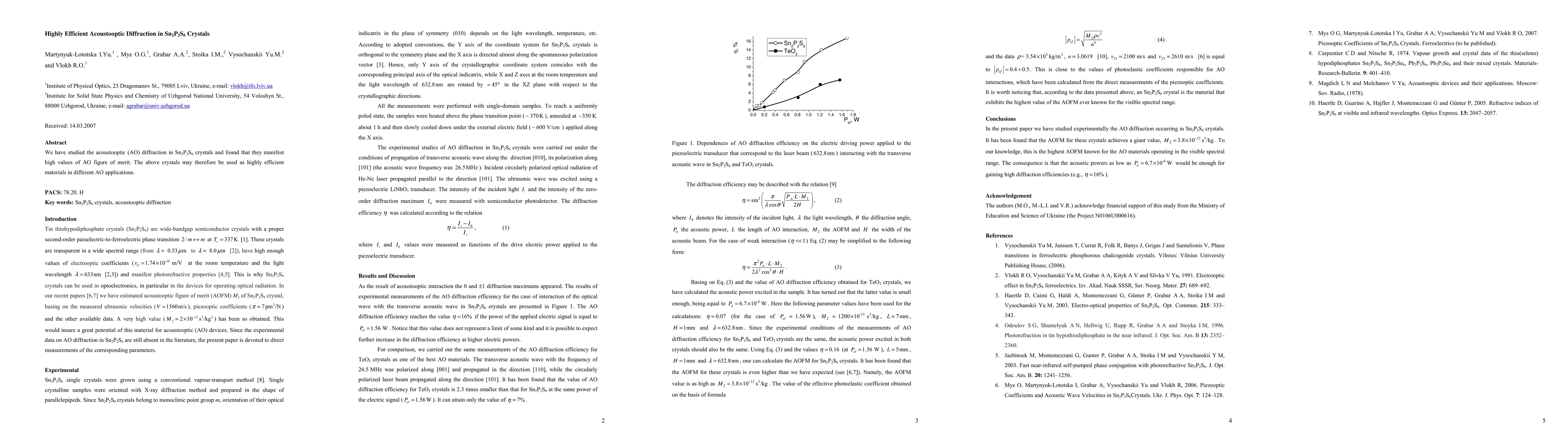 Summary: Sn2P2S6 crystals exhibit high acoustooptic diffraction efficiency, suggesting their potential use in various acoustooptic applications due to their superior AO figure of merit.