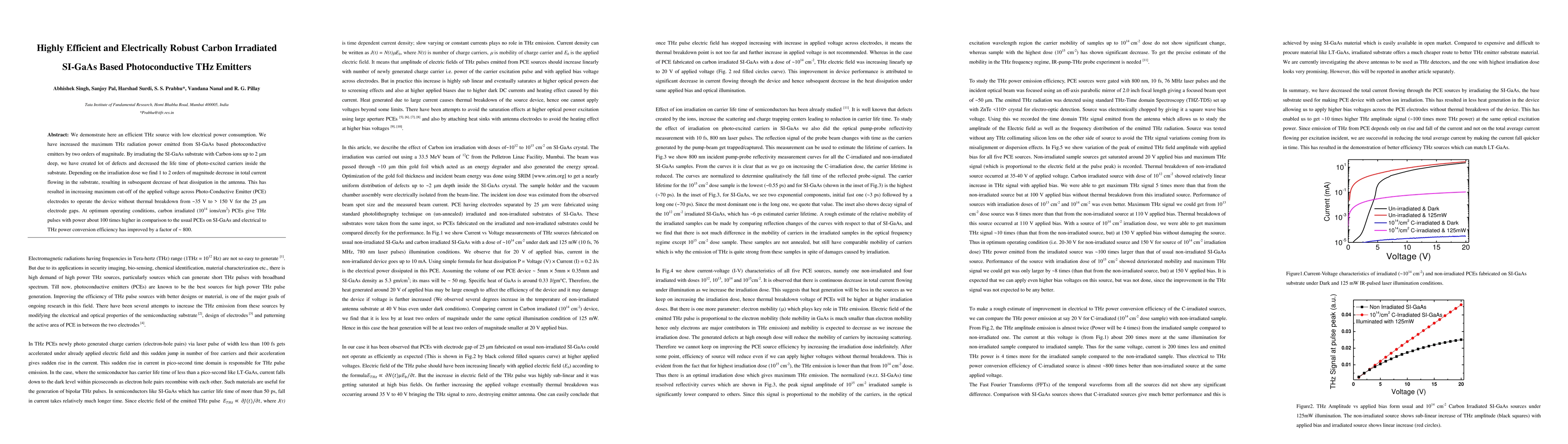 We demonstrate here an efficient THz source with low electrical power consumption. We have increased the maximum THz radiation power emitted from SI-GaAs based photoconductive emitters by two orders of magnitude. By irradiating the SI-GaAs substrate with Carbon-ions up to 2 micron deep, we have created lot of defects and decreased the life time of photo-excited carriers inside the substrate. Depending on the irradiation dose we find 1 to 2 orders of magnitude decrease in total current flowing in the substrate, resulting in subsequent decrease of heat dissipation in the antenna. This has resulted in increasing maximum cut-off of the applied voltage across Photo-Conductive Emitter (PCE) electrodes to operate the device without thermal breakdown from ~35 V to > 150 V for the 25 micron electrode gaps. At optimum operating conditions, carbon irradiated (10^14 ions/cm^2) PCEs give THz pulses with power about 100 times higher in comparison to the usual PCEs on SI-GaAs and electrical to THz power conversion efficiency has improved by a factor of ~ 800.