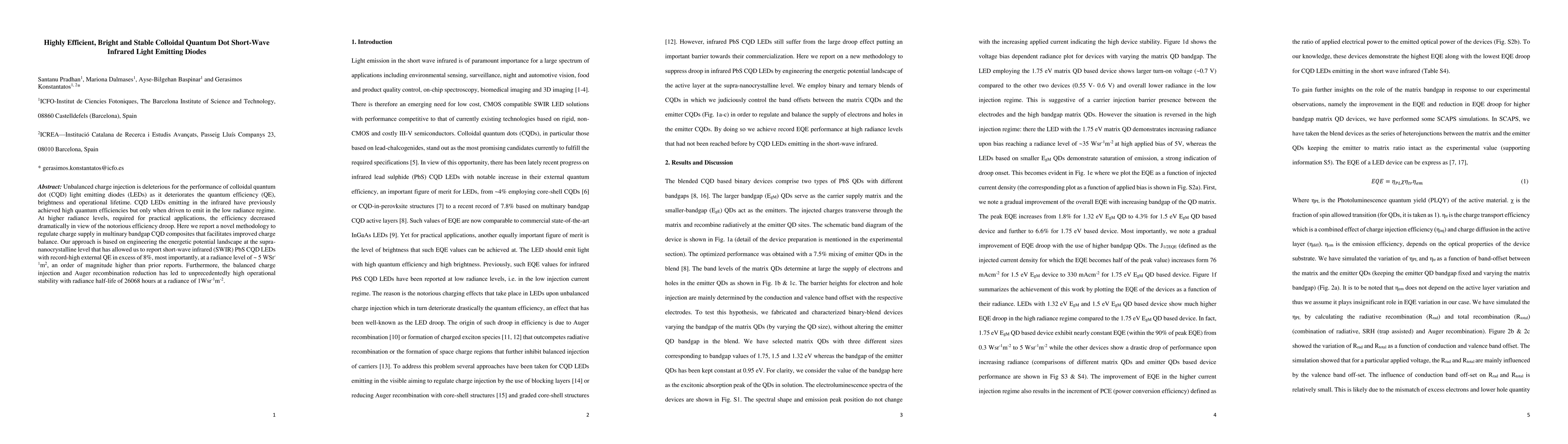 This paper presents a novel method for regulating charge injection in colloidal quantum dot LEDs to achieve highly efficient, bright, and stable short-wave infrared emission, reporting record-high external quantum efficiency of over 8% at significantly higher radiance levels, along with exceptional operational stability.