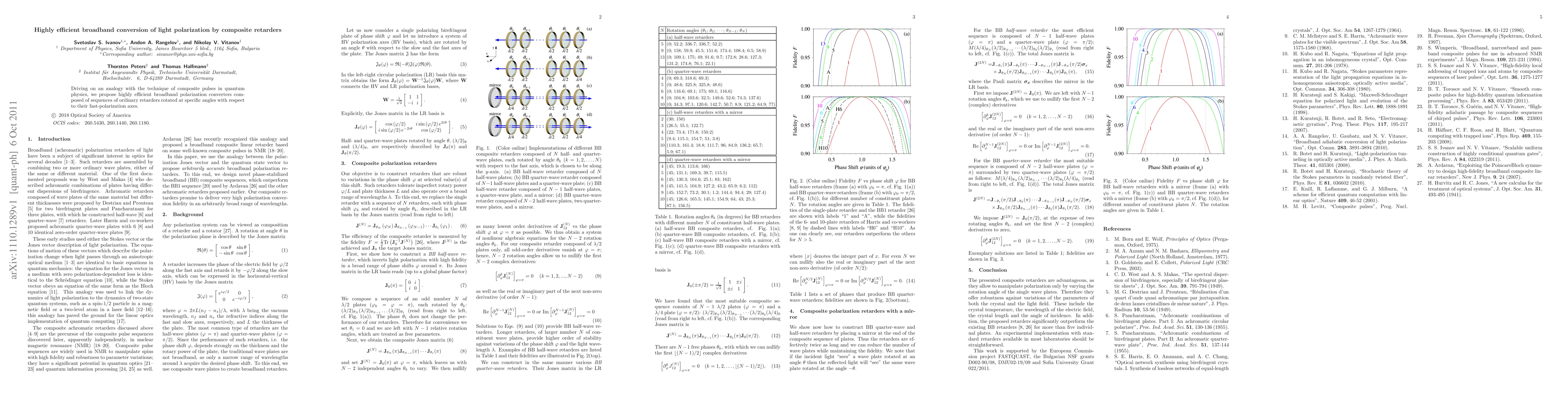 Summary: This paper proposes a novel broadband polarization converter using sequences of rotated ordinary retarders, inspired by composite pulses in quantum physics, to achieve highly efficient light polarization conversion across a wide spectrum. The design leverages specific angle rotations to optimize performance.