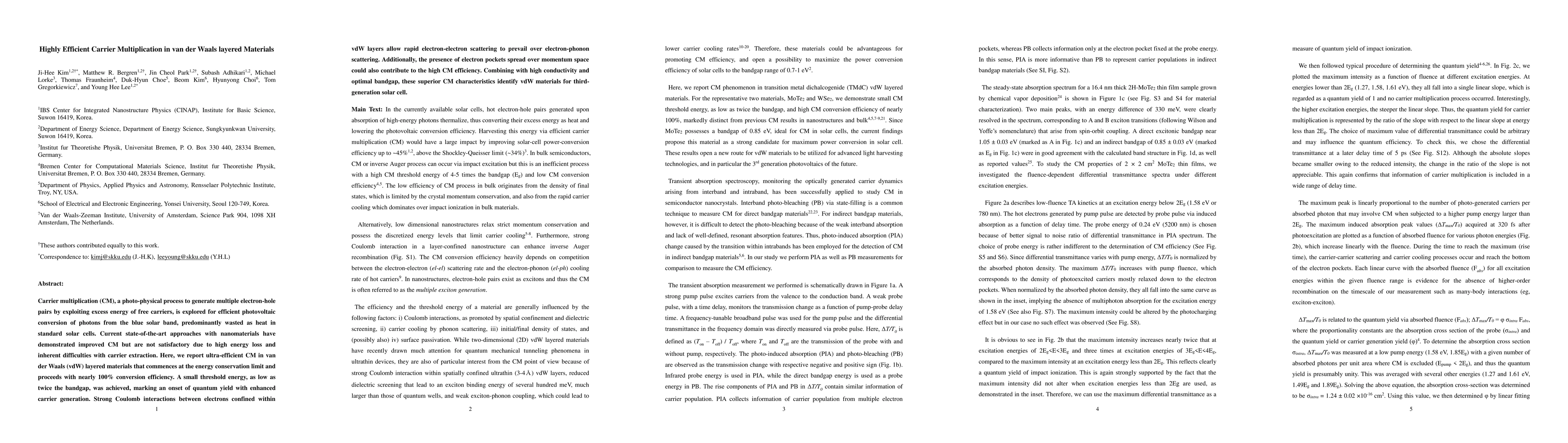 Researchers discovered ultra-efficient carrier multiplication in van der Waals layered materials, achieving nearly 100% conversion efficiency at a low threshold energy, paving the way for third-generation solar cells.