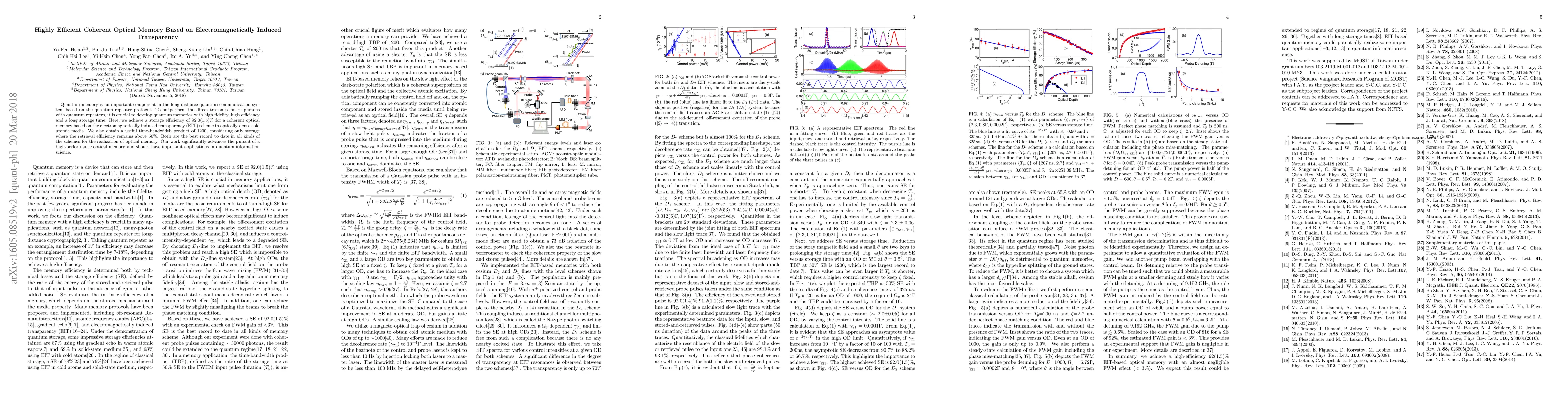 This paper reports a highly efficient coherent optical memory based on electromagnetically induced transparency (EIT) in cold atomic media, achieving a storage efficiency of 92.0(1.5)% and a time-bandwidth product of 1200, setting new records for optical memory performance and advancing quantum information science.