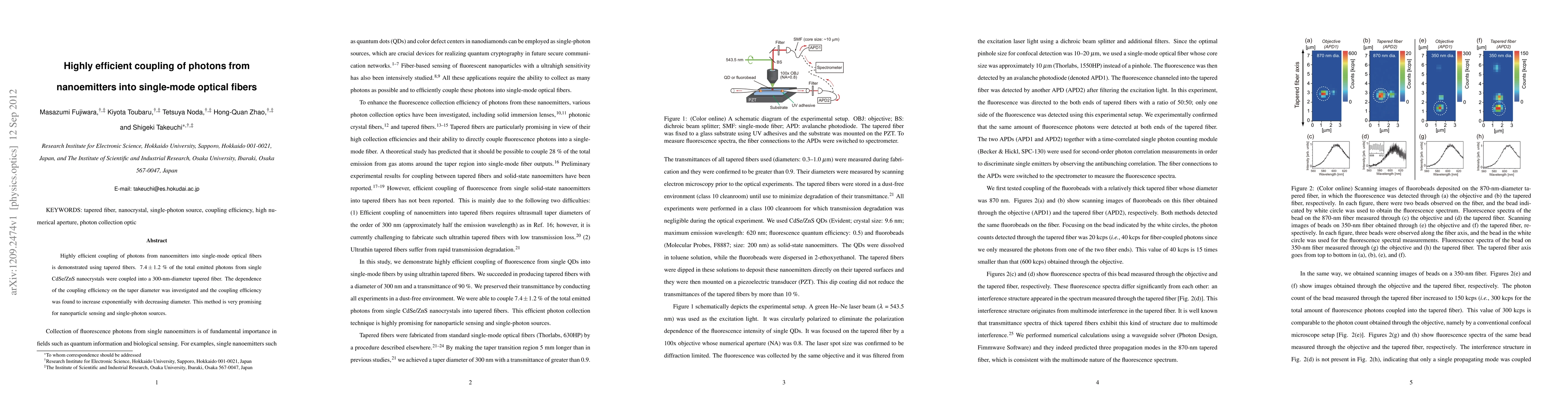 This paper demonstrates a highly efficient method of coupling photons from nanoemitters, such as CdSe/ZnS nanocrystals, into single-mode optical fibers using tapered fibers, achieving up to 7.4% coupling efficiency. The study finds that coupling efficiency increases exponentially with decreasing taper diameter, showing potential for nanoparticle sensing and single-photon applications.