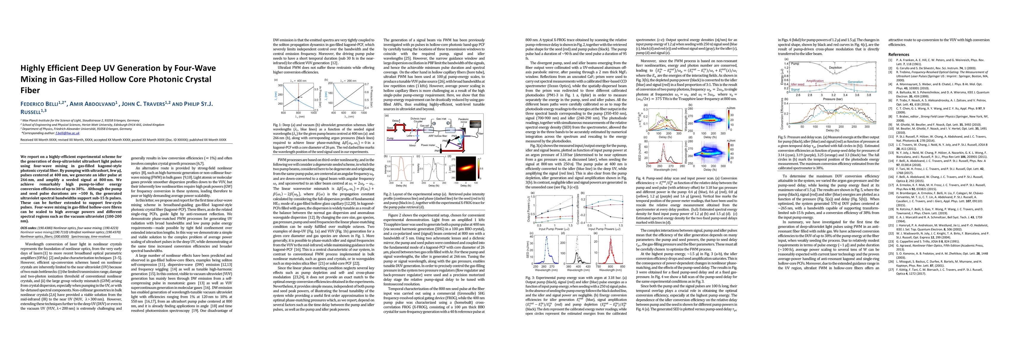 This paper presents an efficient method for generating deep-ultraviolet ultrashort pulses via four-wave mixing in gas-filled photonic crystal fiber, achieving up to 38% conversion efficiency and supporting sub-15 fs pulse durations. The technique can potentially be scaled for high average power and extended to vacuum ultraviolet regions.