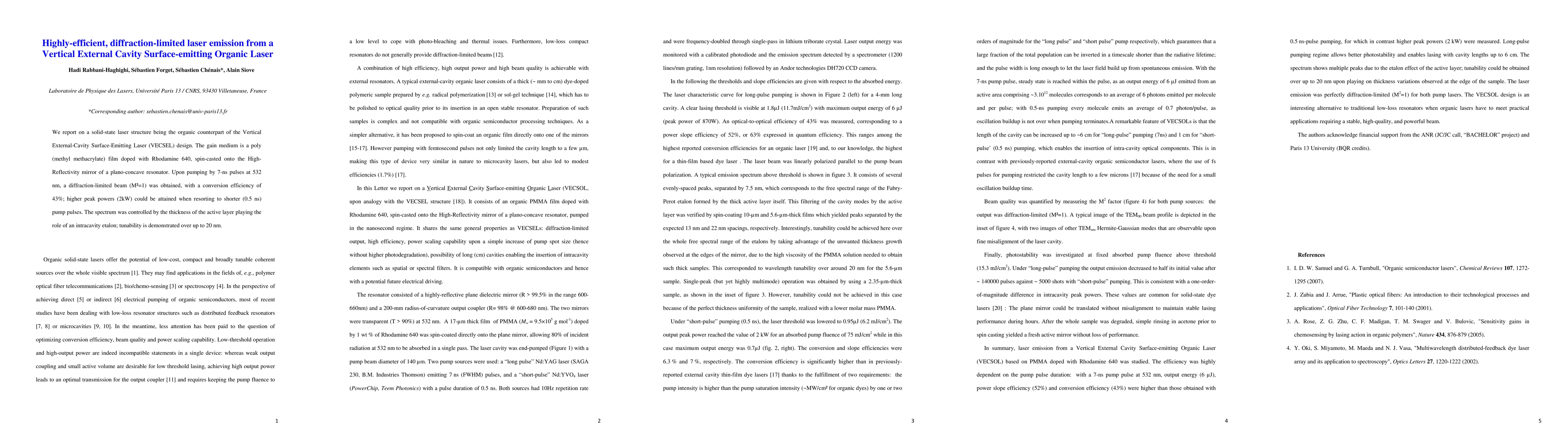 This paper describes a highly efficient, diffraction-limited laser emission from an organic Vertical External Cavity Surface-emitting Laser (VECSEL) using a poly (methyl methacrylate) film doped with Rhodamine 640. The device achieved a conversion efficiency of 43% and tunability over 20 nm.