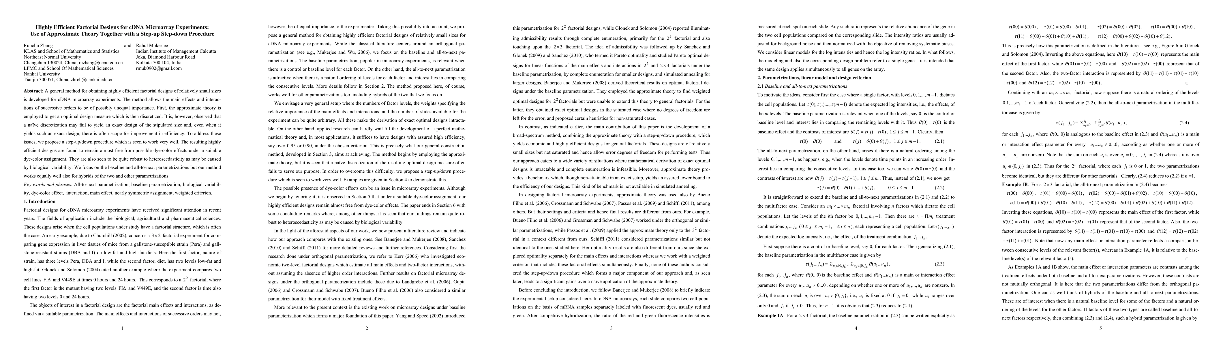 This paper develops a method for creating highly efficient factorial designs for cDNA microarray experiments, employing approximate theory and a step-up/down procedure to optimize design measures. The proposed designs are robust to dye-color effects and heteroscedasticity, and work well for various parametrizations.