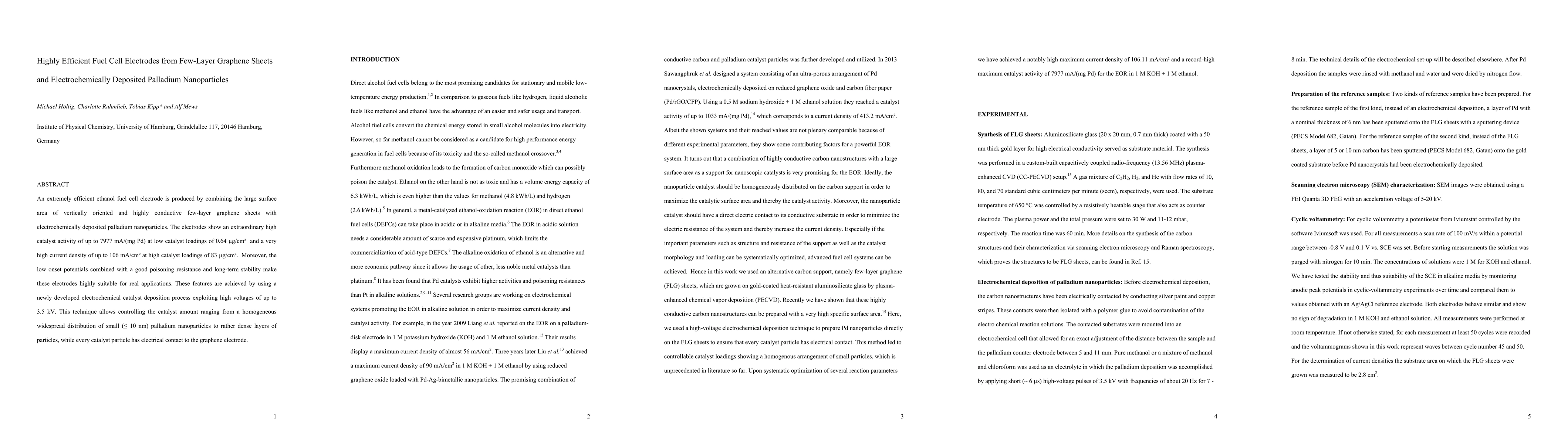 This paper presents highly efficient fuel cell electrodes combining few-layer graphene sheets with electrochemically deposited palladium nanoparticles, achieving exceptional catalyst activity and stability. The innovative high-voltage electrochemical deposition process enables precise control over catalyst distribution, enhancing performance and durability for practical applications.