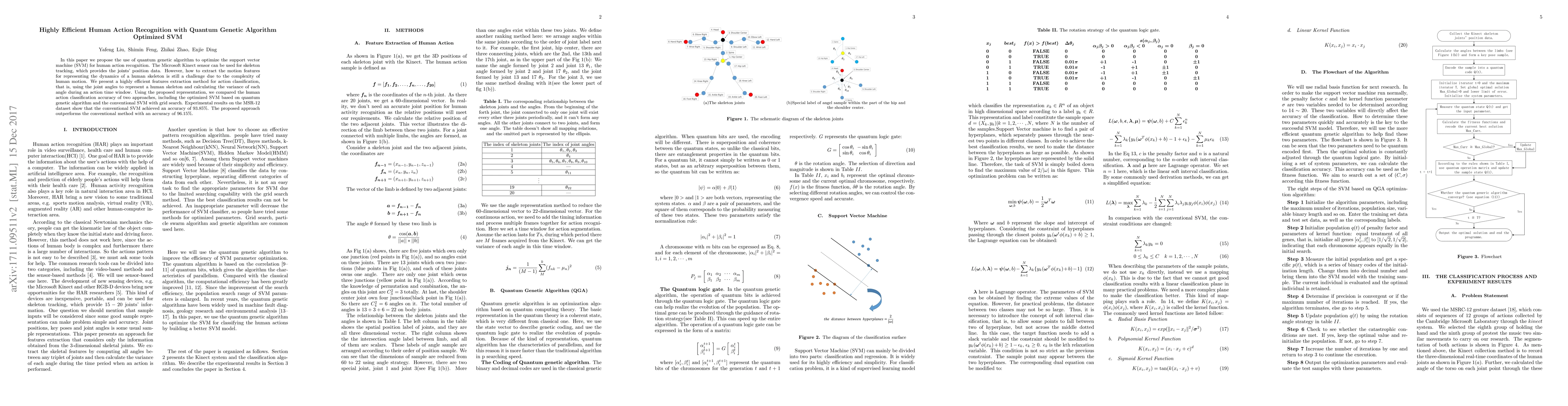 This paper proposes a quantum genetic algorithm to optimize a support vector machine (SVM) for human action recognition using Microsoft Kinect skeleton tracking. The method extracts joint angles and their variance for dynamic representation, achieving an accuracy of 96.15% on the MSR-12 dataset, surpassing the conventional SVM's 93.85% accuracy.