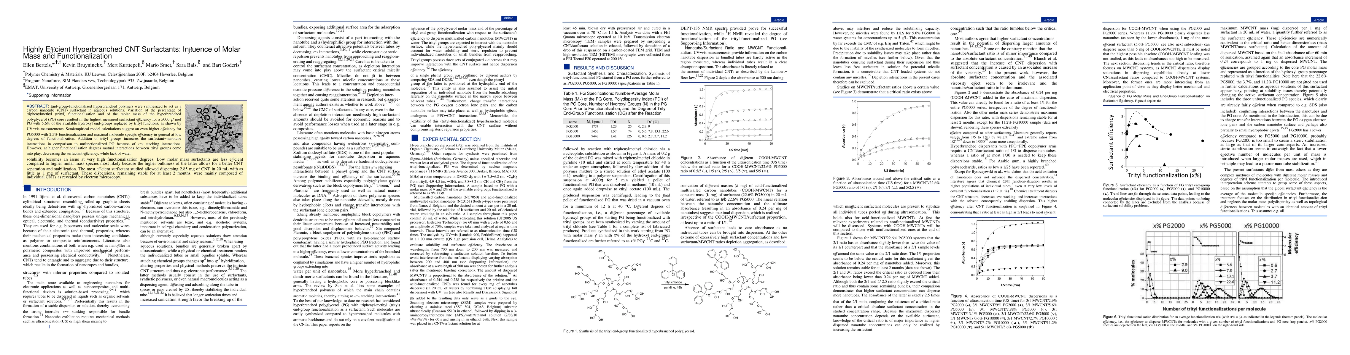Researchers developed hyperbranched CNT surfactants with varying molar mass and functionalization, finding that a 5000 g/mol polyglycerol core with 5.6% trityl groups is the most efficient, allowing for stable dispersion of 2.85 mg CNT in 20 mL.