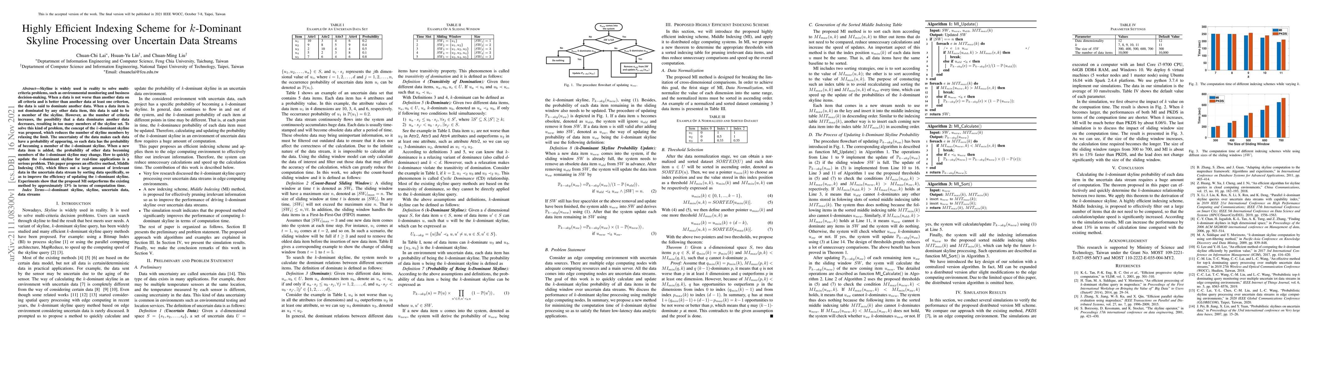 This paper introduces the Middle Indexing (MI) scheme for efficiently updating k-dominant skylines in uncertain data streams, significantly reducing computation time by filtering irrelevant data. Experiments demonstrate MI's 13% improvement over existing methods.