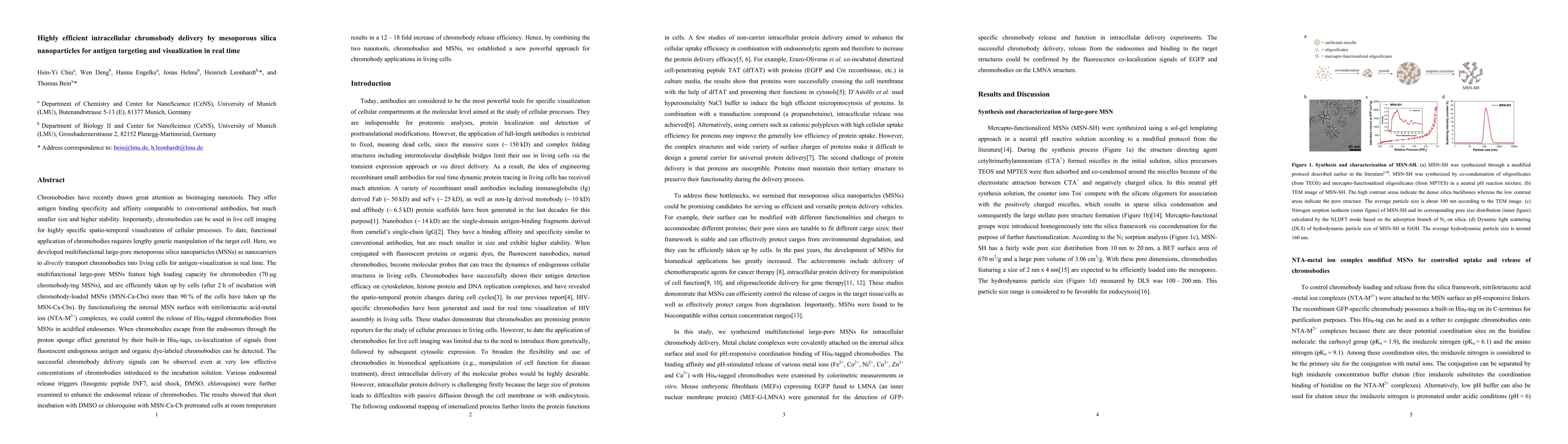 This paper presents a novel method for delivering chromobodies into living cells using large-pore mesoporous silica nanoparticles (MSNs) for real-time antigen visualization. The MSNs efficiently transport chromobodies into cells and release them in acidified endosomes, enabling specific spatio-temporal imaging of cellular processes.