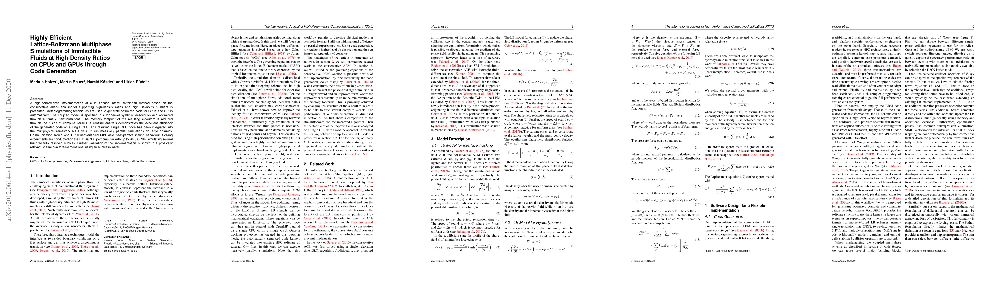 A high-performance implementation of a multiphase lattice Boltzmann method based on the conservative Allen-Cahn model supporting high-density ratios and high Reynolds numbers is presented. Metaprogramming techniques are used to generate optimized code for CPUs and GPUs automatically. The coupled model is specified in a high-level symbolic description and optimized through automatic transformations. The memory footprint of the resulting algorithm is reduced through the fusion of compute kernels. A roofline analysis demonstrates the excellent efficiency of the generated code on a single GPU. The resulting single GPU code has been integrated into the multiphysics framework waLBerla to run massively parallel simulations on large domains. Communication hiding and GPUDirect-enabled MPI yield near-perfect scaling behaviour. Scaling experiments are conducted on the Piz Daint supercomputer with up to 2048 GPUs, simulating several hundred fully resolved bubbles. Further, validation of the implementation is shown in a physically relevant scenario-a three-dimensional rising air bubble in water.