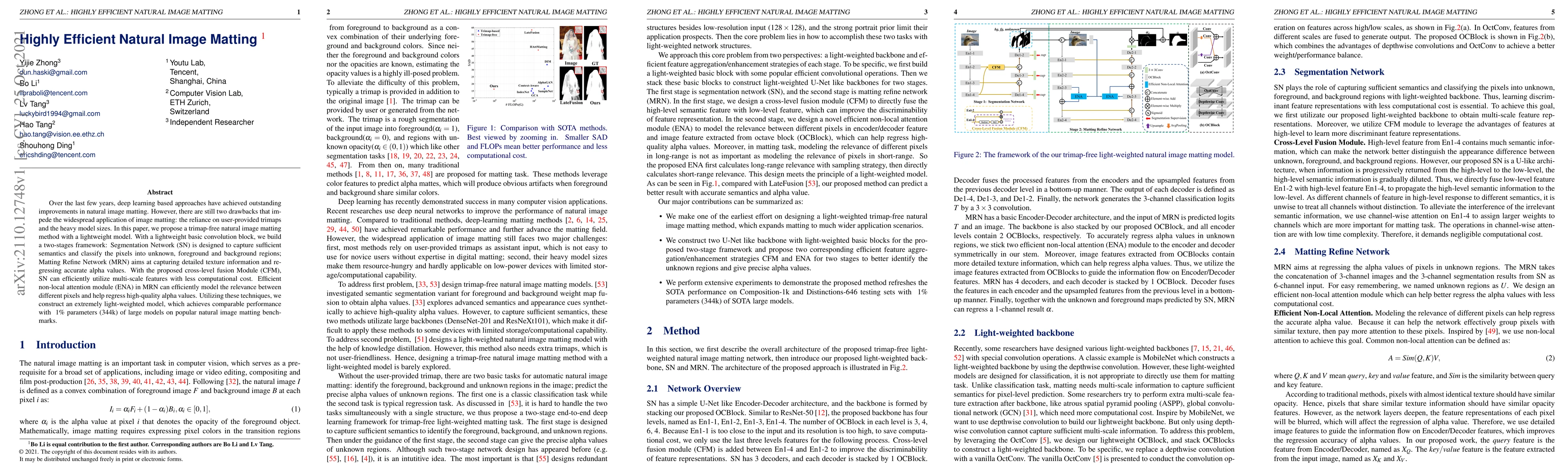 This paper presents a trimap-free, lightweight natural image matting method using a two-stage segmentation and matting network. It achieves high efficiency with a small model size, comparable to larger models, by employing a cross-level fusion module and a non-local attention mechanism.