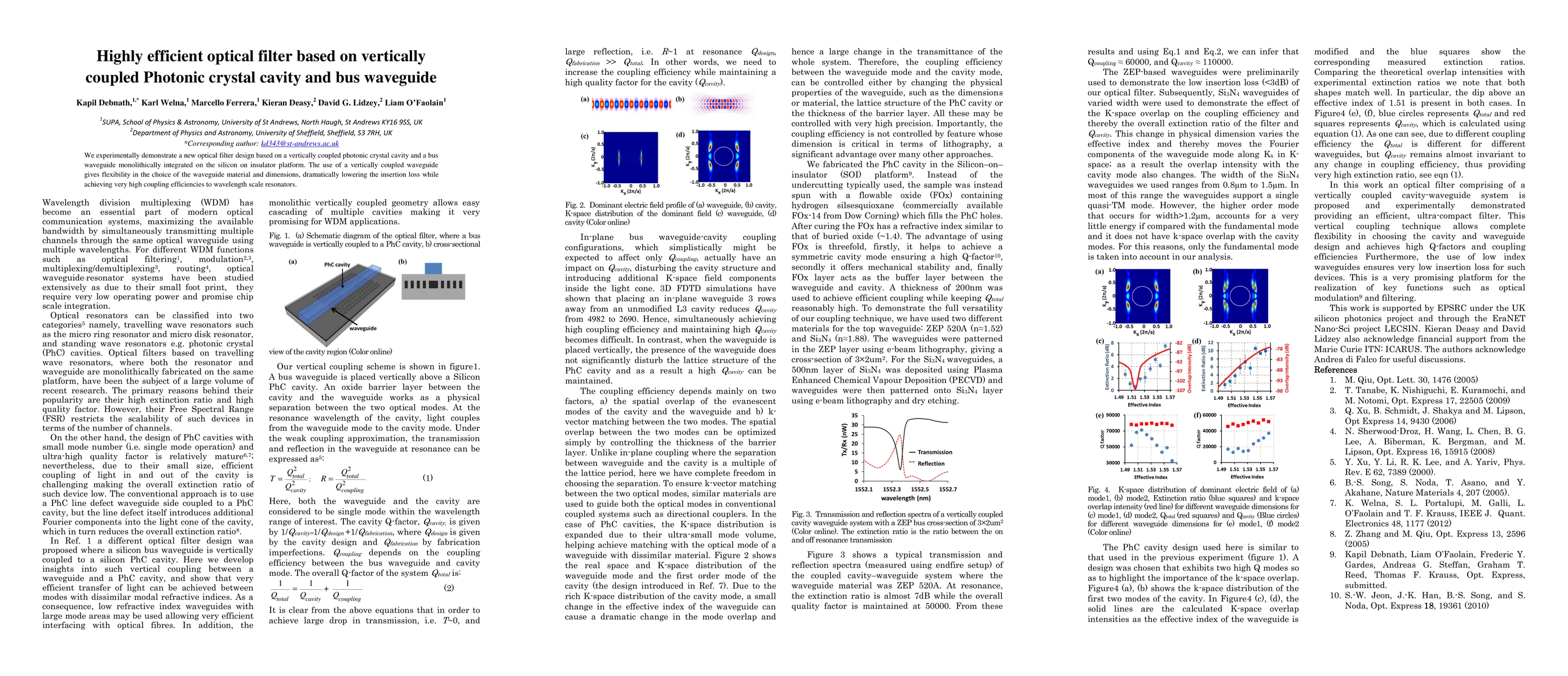 This paper presents an efficient optical filter design using a vertically coupled photonic crystal cavity and bus waveguide on a silicon on insulator platform, achieving low insertion loss and high coupling efficiency. The design flexibility allows for varied material and dimensions, enhancing performance.