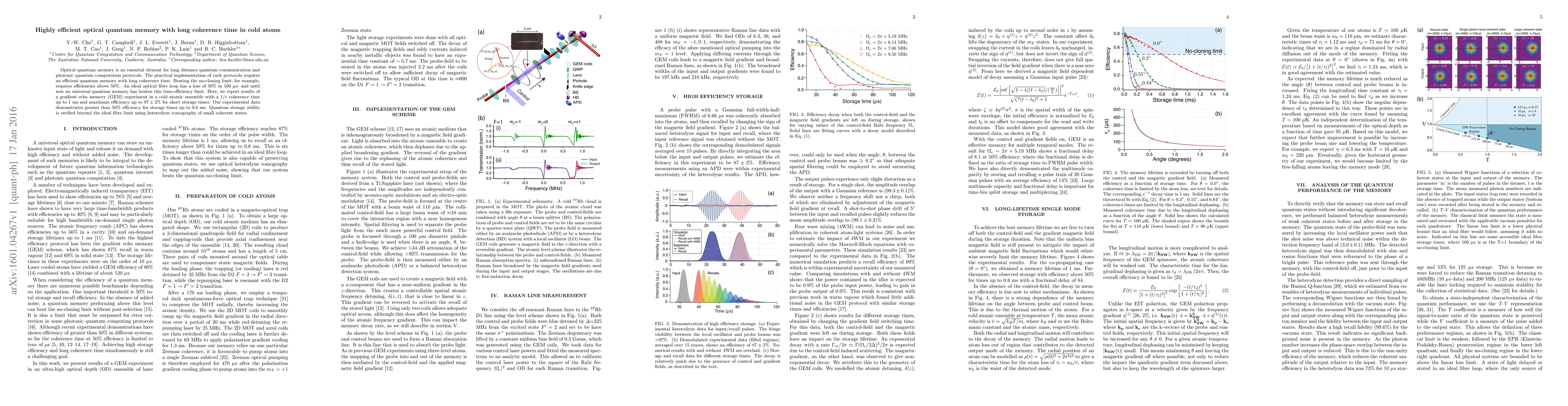 This paper presents a highly efficient optical quantum memory using gradient echo memory in cold atoms, achieving a maximum efficiency of 87±2% and a 1/e coherence time up to 1ms, surpassing the ideal fiber limit and demonstrating greater than 50% efficiency for storage times up to 0.6ms.