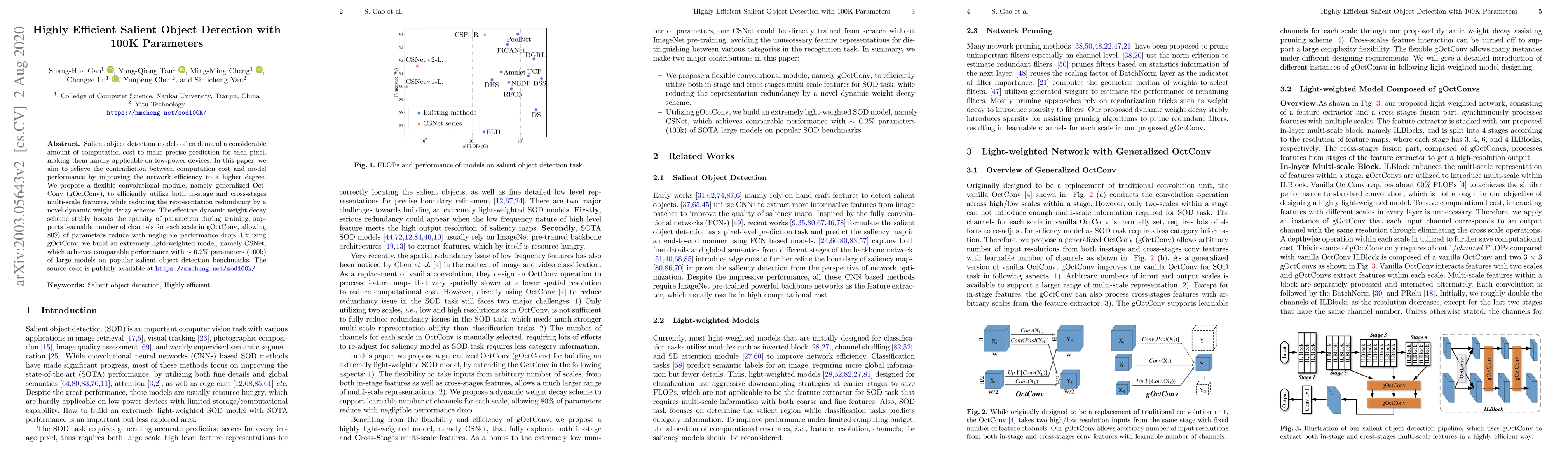 Salient object detection models often demand a considerable amount of computation cost to make precise prediction for each pixel, making them hardly applicable on low-power devices. In this paper, we aim to relieve the contradiction between computation cost and model performance by improving the network efficiency to a higher degree. We propose a flexible convolutional module, namely generalized OctConv (gOctConv), to efficiently utilize both in-stage and cross-stages multi-scale features, while reducing the representation redundancy by a novel dynamic weight decay scheme. The effective dynamic weight decay scheme stably boosts the sparsity of parameters during training, supports learnable number of channels for each scale in gOctConv, allowing 80% of parameters reduce with negligible performance drop. Utilizing gOctConv, we build an extremely light-weighted model, namely CSNet, which achieves comparable performance with about 0.2% parameters (100k) of large models on popular salient object detection benchmarks.
