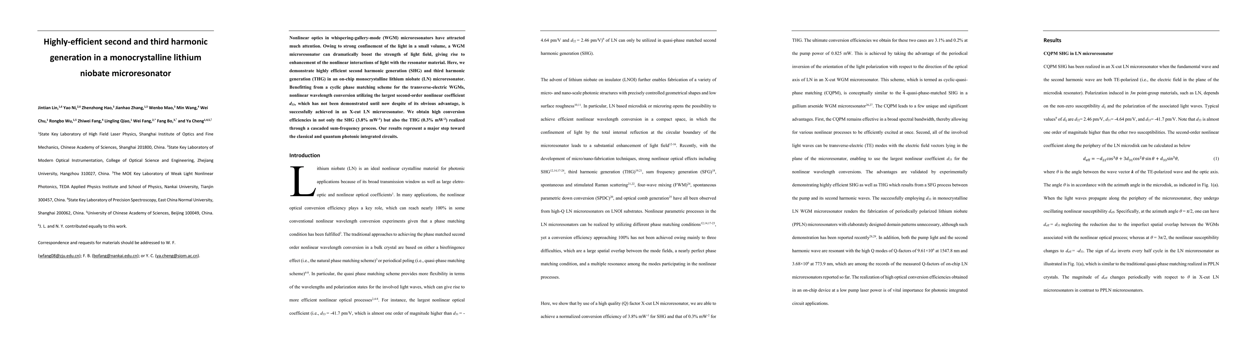 This paper demonstrates highly efficient second and third harmonic generation in a monocrystalline lithium niobate microresonator, utilizing a cyclic phase matching scheme and achieving significant conversion efficiencies of 3.8% mW^-1 for SHG and 0.3% mW^-2 for THG. This breakthrough in nonlinear optics supports advancements in photonic integrated circuits.