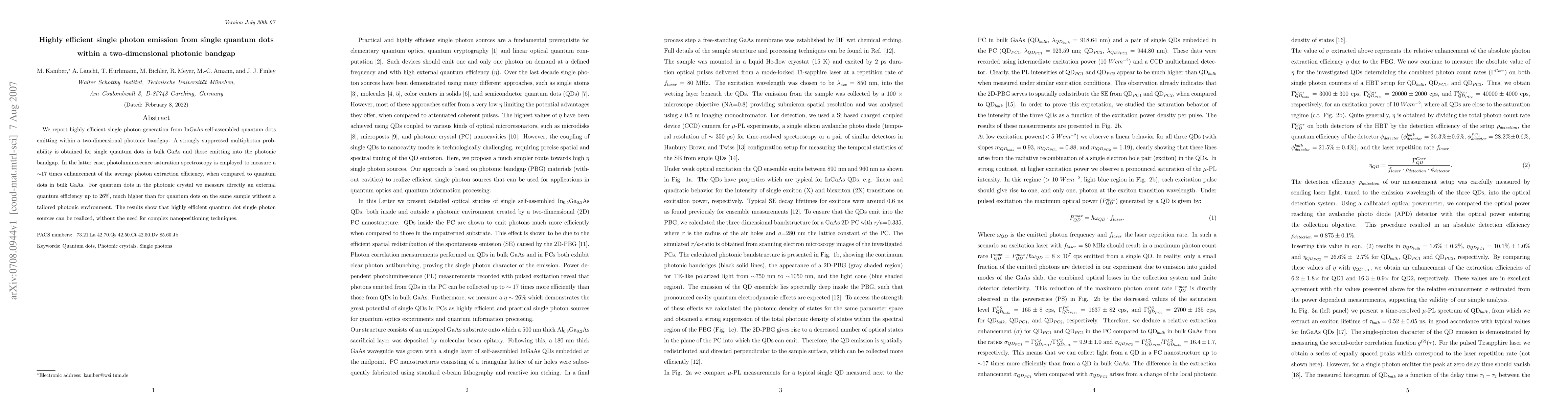This paper reports highly efficient single photon emission from InGaAs quantum dots within a two-dimensional photonic bandgap, achieving a 17-fold enhancement in photon extraction efficiency compared to bulk GaAs quantum dots. The external quantum efficiency reaches up to 26%, demonstrating the potential for efficient quantum dot single photon sources without complex positioning.