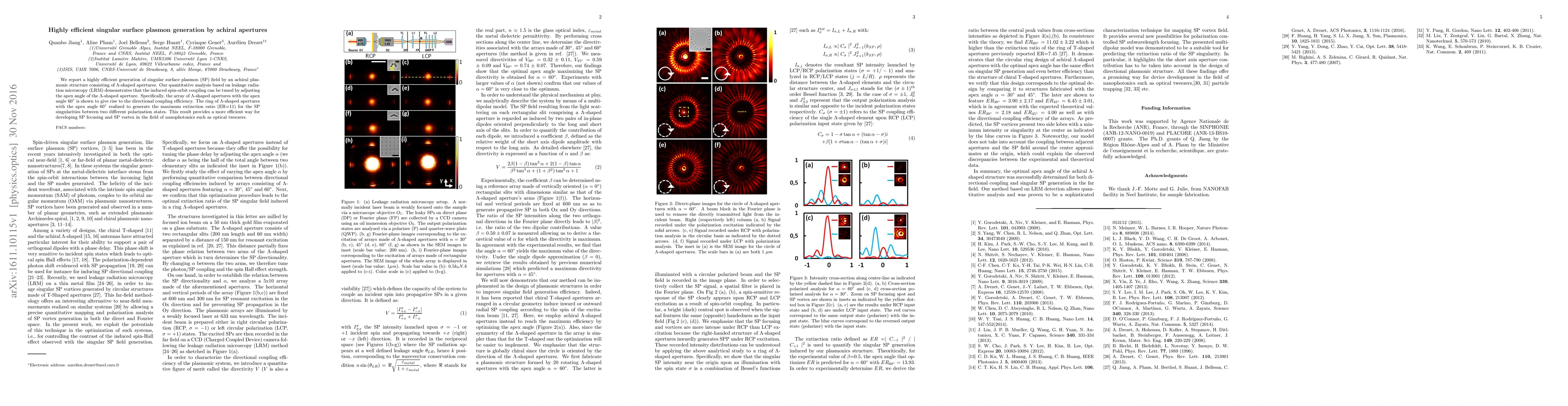 We report a highly efficient generation of singular surface plasmon (SP) field by an achiral plasmonic structure consisting of $\Lambda$-shaped apertures. Our quantitative analysis based on leakage radiation microscopy (LRM) demonstrates that the induced spin-orbit coupling can be tuned by adjusting the apex angle of the $\Lambda$-shaped aperture. Specifically, the array of $\Lambda$-shaped apertures with the apex angle $60^\circ$ is shown to give rise to the directional coupling efficiency. The ring of $\Lambda$-shaped apertures with the apex angle $60^\circ$ realized to generate the maximum extinction ratio (ER=11) for the SP singularities between two different polarization states. This result provides a more efficient way for developing SP focusing and SP vortex in the field of nanophotonics such as optical tweezers.